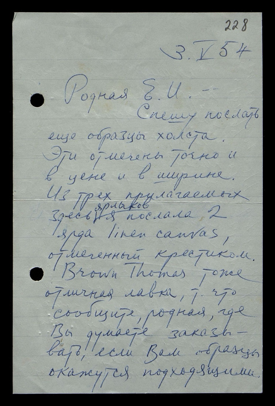 Спешу послать ещё образцы холста. Эти отмечены точно и в цене, и в ширине. Из трёх прилагаемых здесь ярлыков я послала 2 ярда Linen canvas, отмеченный крестиком. Brown Thomas тоже отличная лавка, так что сообщите, родная, где Вы думаете заказывать, если Вам образцы окажутся подходящими.