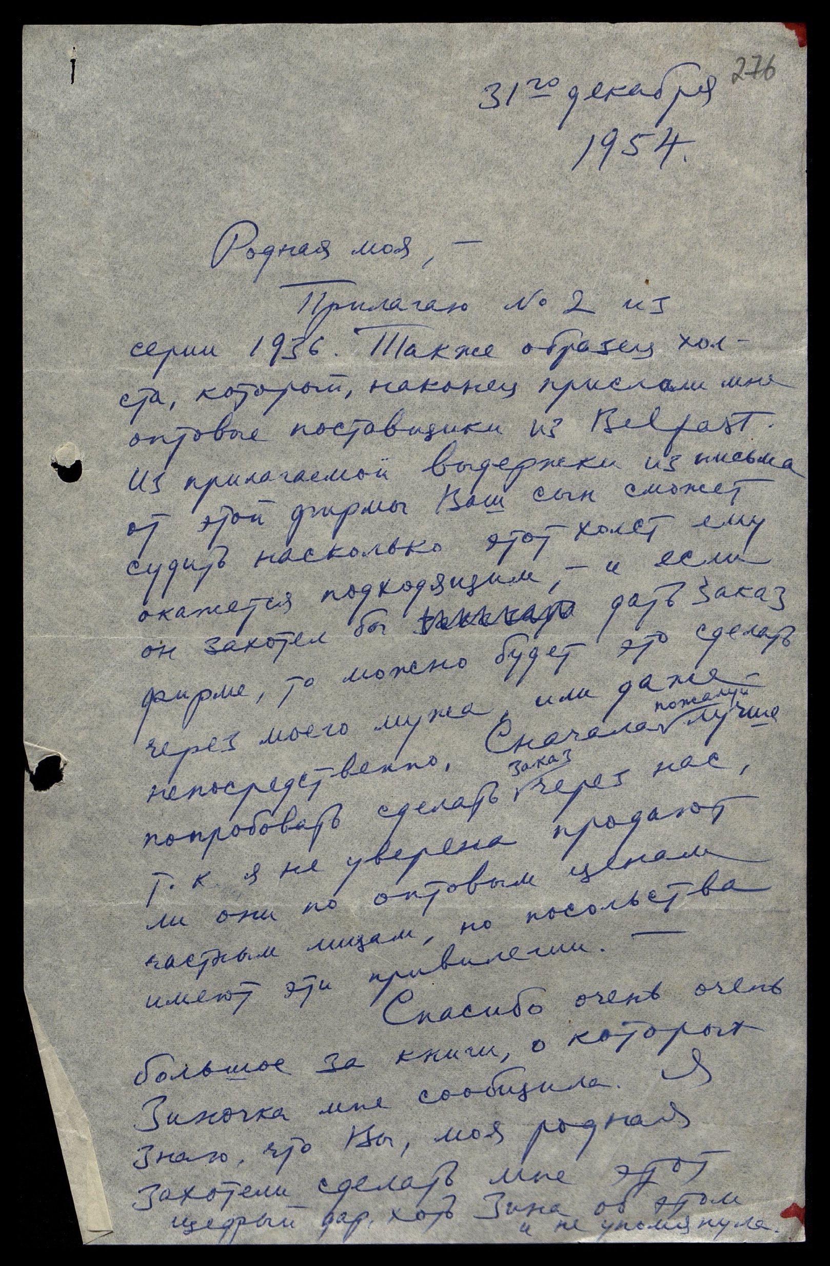Прилагаю № 2 из серии 1936. Также образец холста, который, наконец, прислали мне оптовые поставщики из Belfast. Из прилагаемой выдержки из письма от этой фирмы Ваш сын сможет судить, насколько этот холст ему окажется подходящим, и если он захотел бы дать заказ фирме, то можно будет это сделать через моего мужа или даже непосредственно. Сначала, пожалуй, лучше попробовать сделать заказ через нас, так как я не уверена, продают ли они по оптовым ценам частным лицам, но посольства имеют эти привилегии.