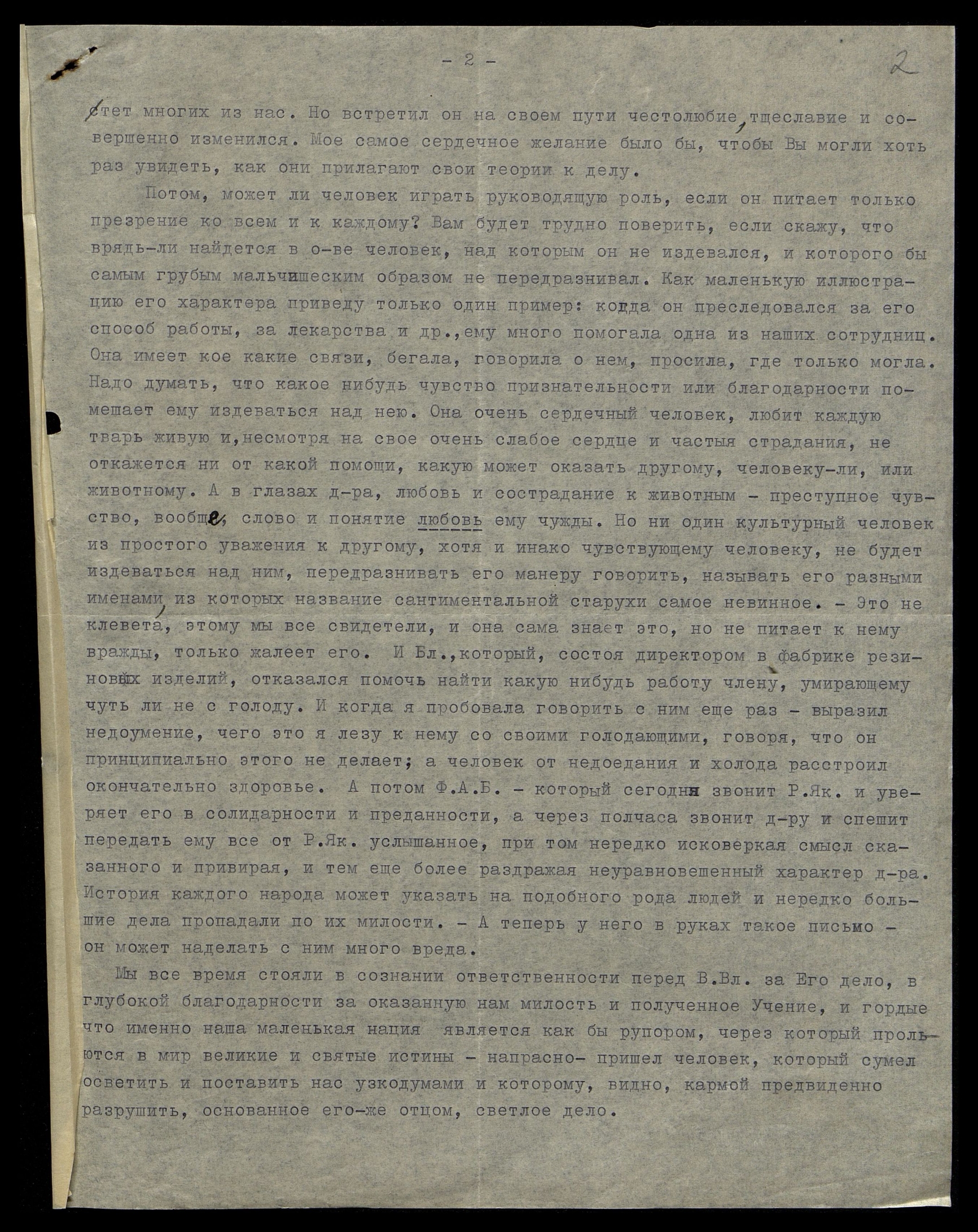 Мы всё время стояли в сознании ответственности перед В[еликим] Вл[адыкой] за Его дело, в глубокой благодарности за оказанную нам милость и полученное Учение, и гордые, что именно наша маленькая нация является как бы рупором, через который прольются в мир великие и святые истины, напрасно, пришёл человек, который сумел осветить и поставить нас узкодумами и которому, видно, кармой предвидено разрушить, основанное его же отцом светлое дело.