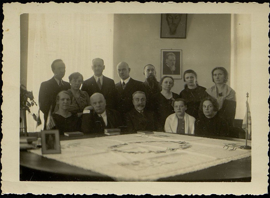 Члены Латвийского общества Рериха. Рига, 1936 г. Сидят: О. Крауклис, Ф. Буцен, А. Клизовский, Е. Драудзинь, Л. Слетова. Стоят: Р. Рудзитис, М. Лицис, К. Валковский, Зальцман, К. Вайчулёнис, О. Мисинь, Е. Фрицберг, Э. Рудзите.