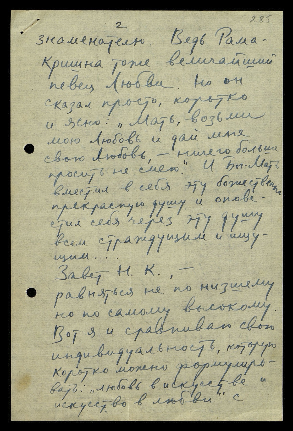 Завет Н[иколая] К[онстантиновича] — равняться не по низшему, но по самому высокому. Вот я и сравниваю свою индивидуальность, которую коротко можно формулировать: "Любовь в искусстве и искусство в любви" с