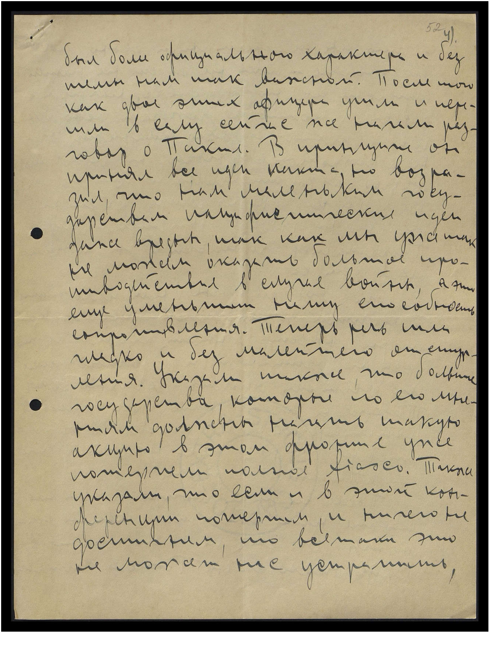 был более официального характера, и без темы, нам так важной. После того как двое этих офицера ушли и перешли в залу, сейчас же начали разговор о Пакте. В принципе он принял все идеи Пакта, но возразил, что нам, маленьким государствам пацифистские идеи даже вредны, так как мы уже так не можем оказать большое противодействие в случае войны, а это ещё уменьшит нашу способность сопротивляться. Теперь речь шла гладко и без малейшего отступления. Указали также, что большие государства, которые по его мнениям должны начать такую акцию в этом фронте уже потерпели полное fiasco. Также указали, что если и в этой конференции потерпим и ничего не достигнем, то всё-таки это не может нас устрашить,
