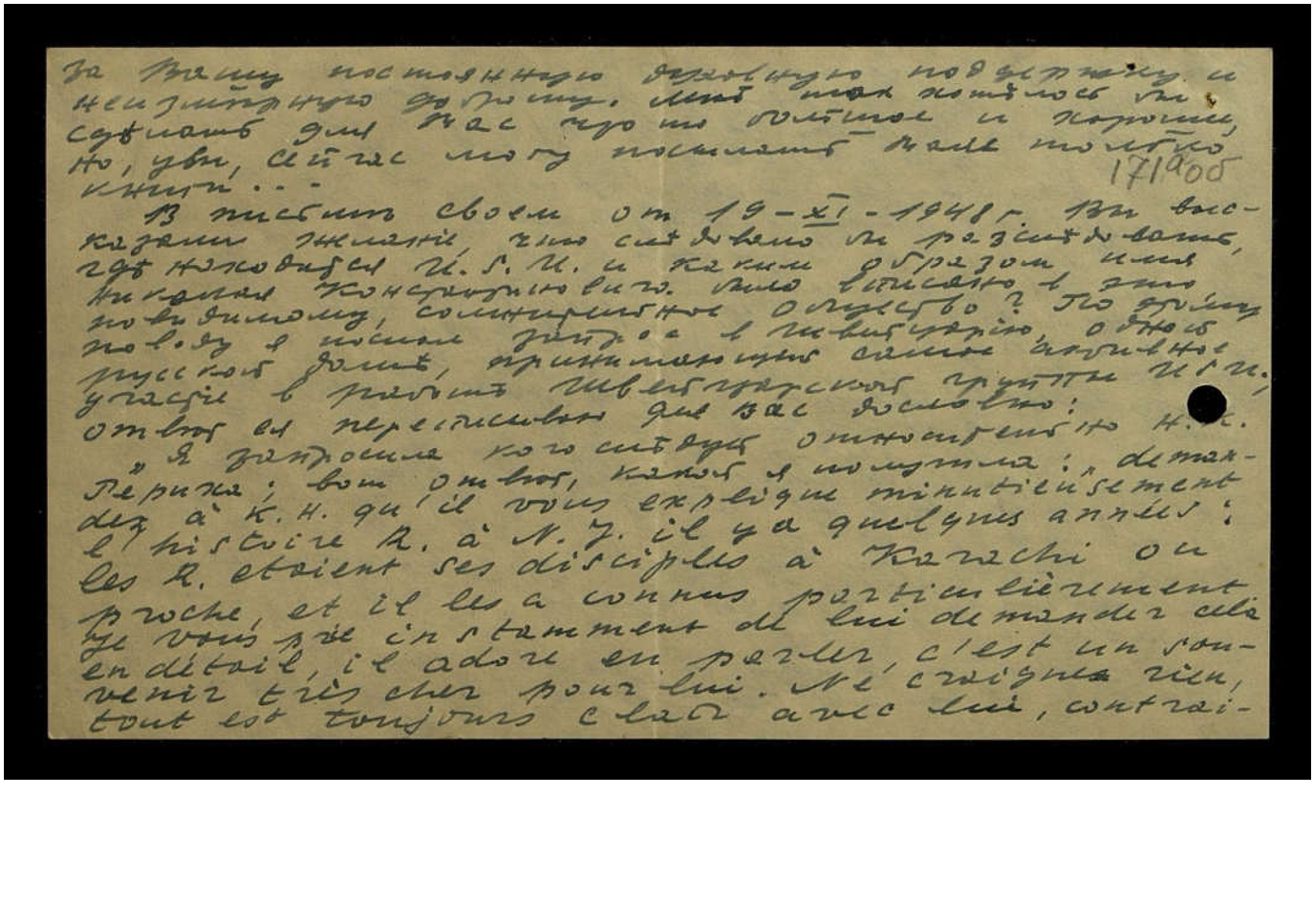 "Я запросила кого следует относительно Н[иколая] К[онстантиновича] Рериха, вот ответ, какой я получила: "demandez a K.H. qu'il vous expliquer minutieusement l'histoire R. á N.I. il ya quelques années: les R. etoient ses disciples á Karachi ou proche, et il les a connus particulièrement. Je vous prie instamment de lui demander cela en détail, il adore en parler, c'est un souvenir tres cher pour lui. Ne craignez rien, tout est toujours clair avec lui, contrai
