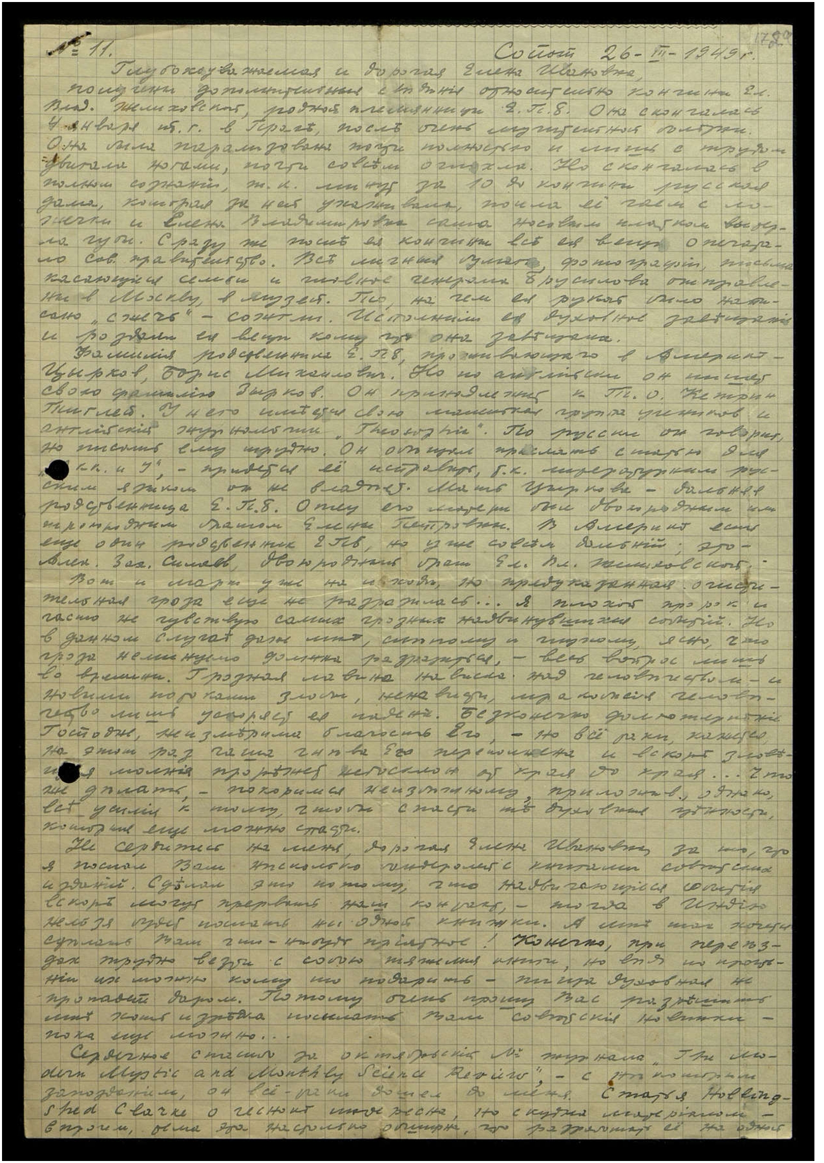 Из этой цитаты Вы видите, что Е.Н. (?) не отождествляла Н[иколая] К[онстантиновича] с движением. Конечно, я могу и лично его спросить, но, на мой взгляд, всё ясно и без того". (Из письма от 13-II-49).