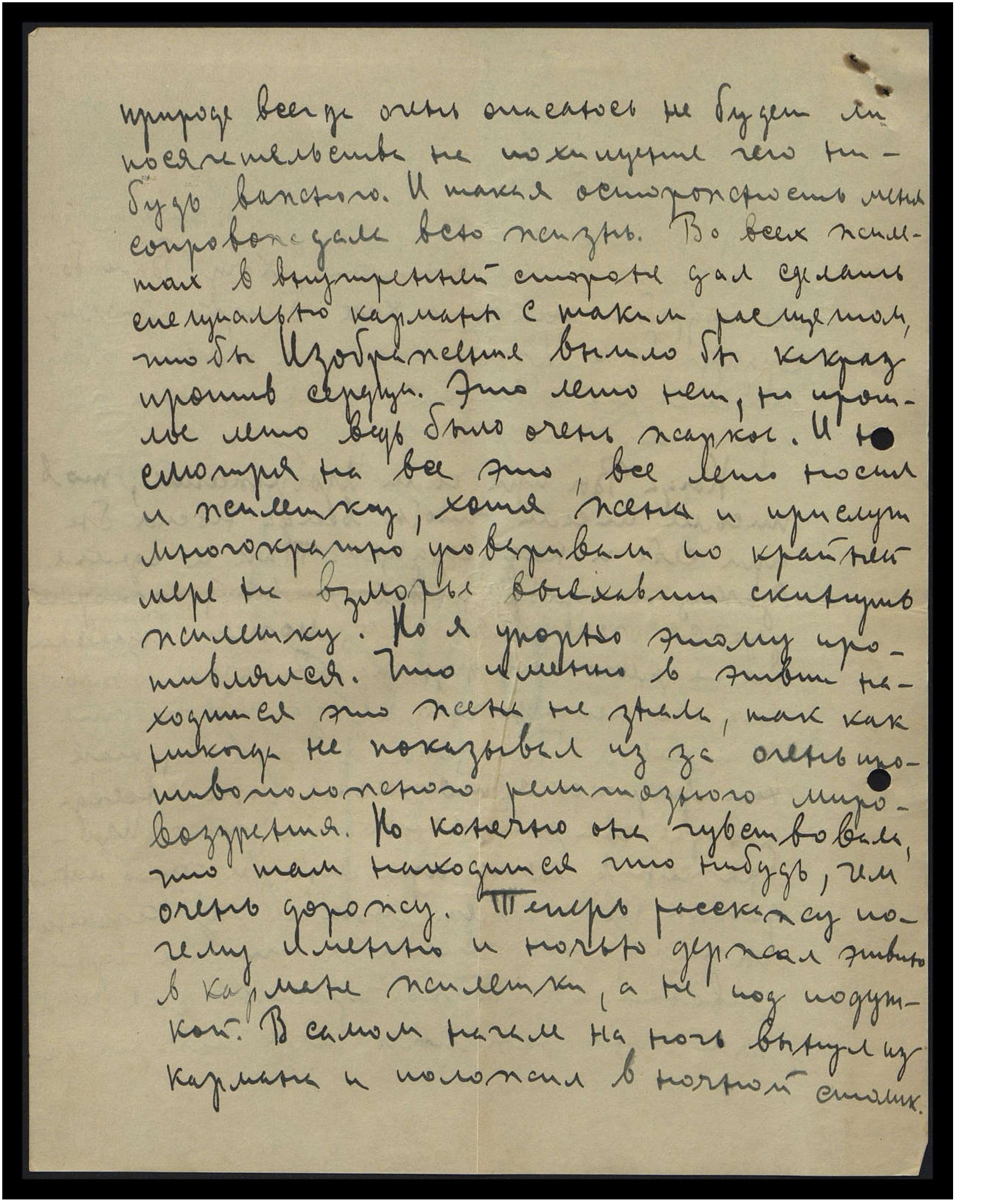 природе всегда очень опасаюсь, не будет ли посягательство на похищение чего-нибудь важного. И такая осторожность меня сопровождала всю жизнь. Во всех жилетах в внутренней стороне дал сделать специально карманы с таким расчётом, чтобы Изображение вышло бы как раз против сердца. Это лето нет, но прошлое лето ведь было очень жаркое. И несмотря на всё это, всё лето носил и жилетку, хотя жена и прислуги многократно уговаривали, по крайней мере на взморье выехавши, скинуть жилетку. Но я упорно этому противился. Что именно в этвии находится, жена не знала, так как никогда не показывал из-за очень противоположного религиозного мировоззрения. Но, конечно, она чувствовала, что там находится что-нибудь, чем очень дорожу. Теперь расскажу, почему именно и ночью держал этвию в кармане жилетки, а не под подушкой. В самом начале на ночь вынул из кармана и положил в ночной столик.