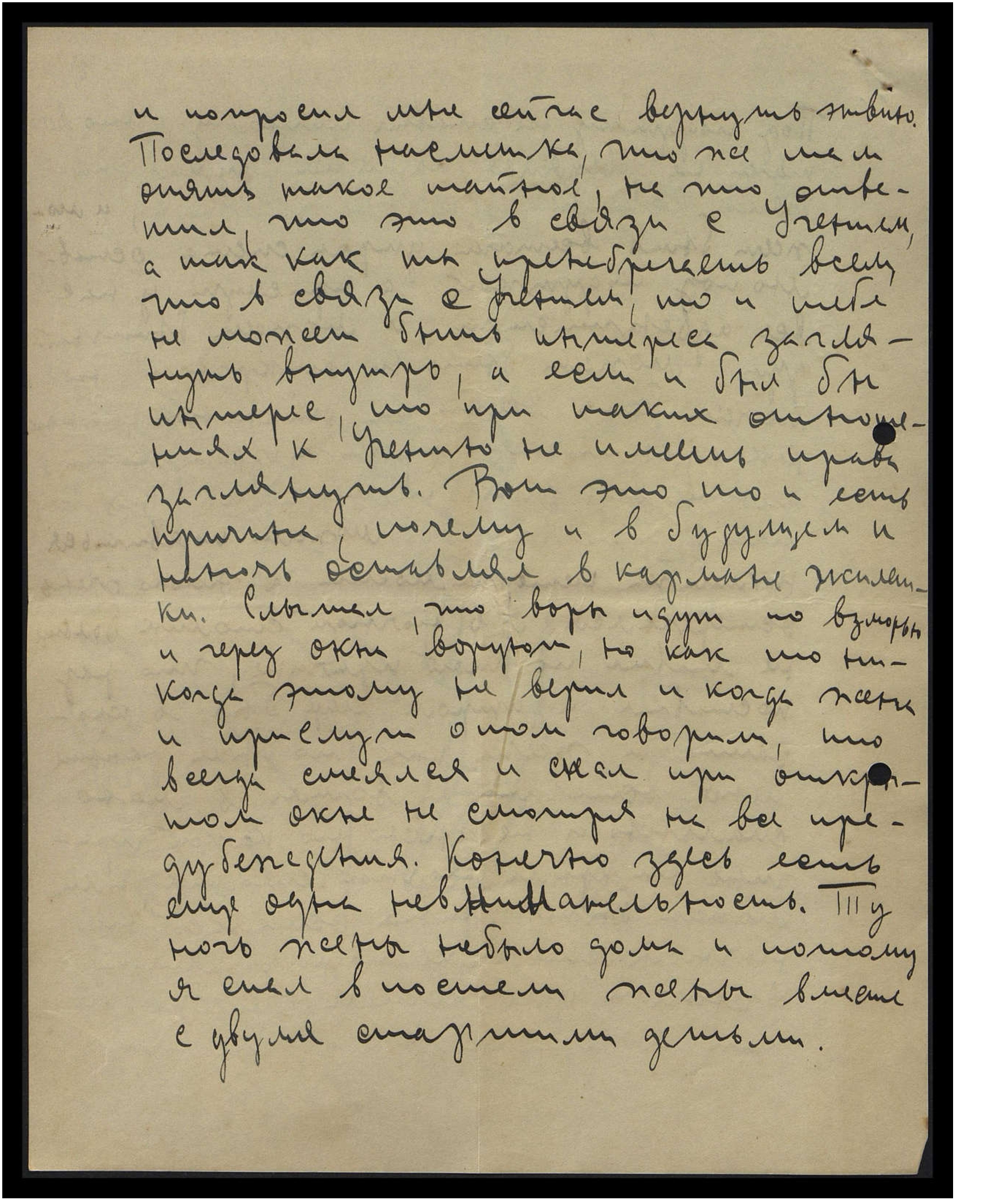 Уже долго последнее время накапливал и напрягал мысли, чтобы Вам писать подобное письмо. В одном из последних писем писал Вам в роде исповеди, но ничего не вышло. И это "не вышло" не даёт покоя. И собирался это письмо писать с большой радостью, хотя и не было точного плана и, может быть, опять ничего не удалось бы; да, но собрался с большой радостью, а теперь пришли события, которые всё, всё перевернули. Были у меня и в прошлой неделе весёлые события, и
