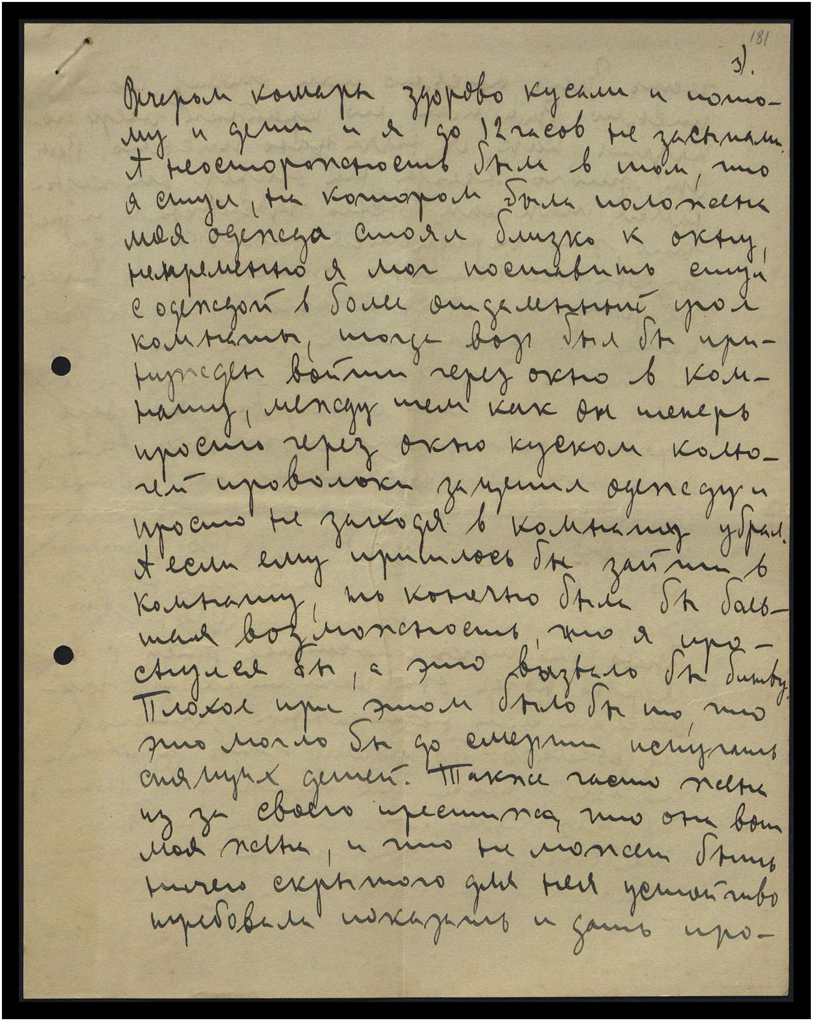 Вечером комары здорово кусали, и потому и дети, и я до 12 часов не засыпали. А неосторожность была в том, что и стул, на котором была положена моя одежда, стоял близко к окну, непременно я мог поставить стул с одеждой в более отдалённый угол комнаты, тогда вор был бы принужден войти через окно в комнату, между тем, как он теперь просто через окно куском колючей проволоки зацепил одежду и просто, не заходя в комнату, убрал. А если ему пришлось бы зайти в комнату, то конечно, была бы большая возможность, что я проснулся бы, а это вызвало бы битву. Плохое при этом было бы то, что это могло бы до смерти испугать спящих детей. Также часто жена из-за своего престижа, что она вот моя жена, и что не может быть ничего скрытого для нея, устойчиво требовала показать и дать про-