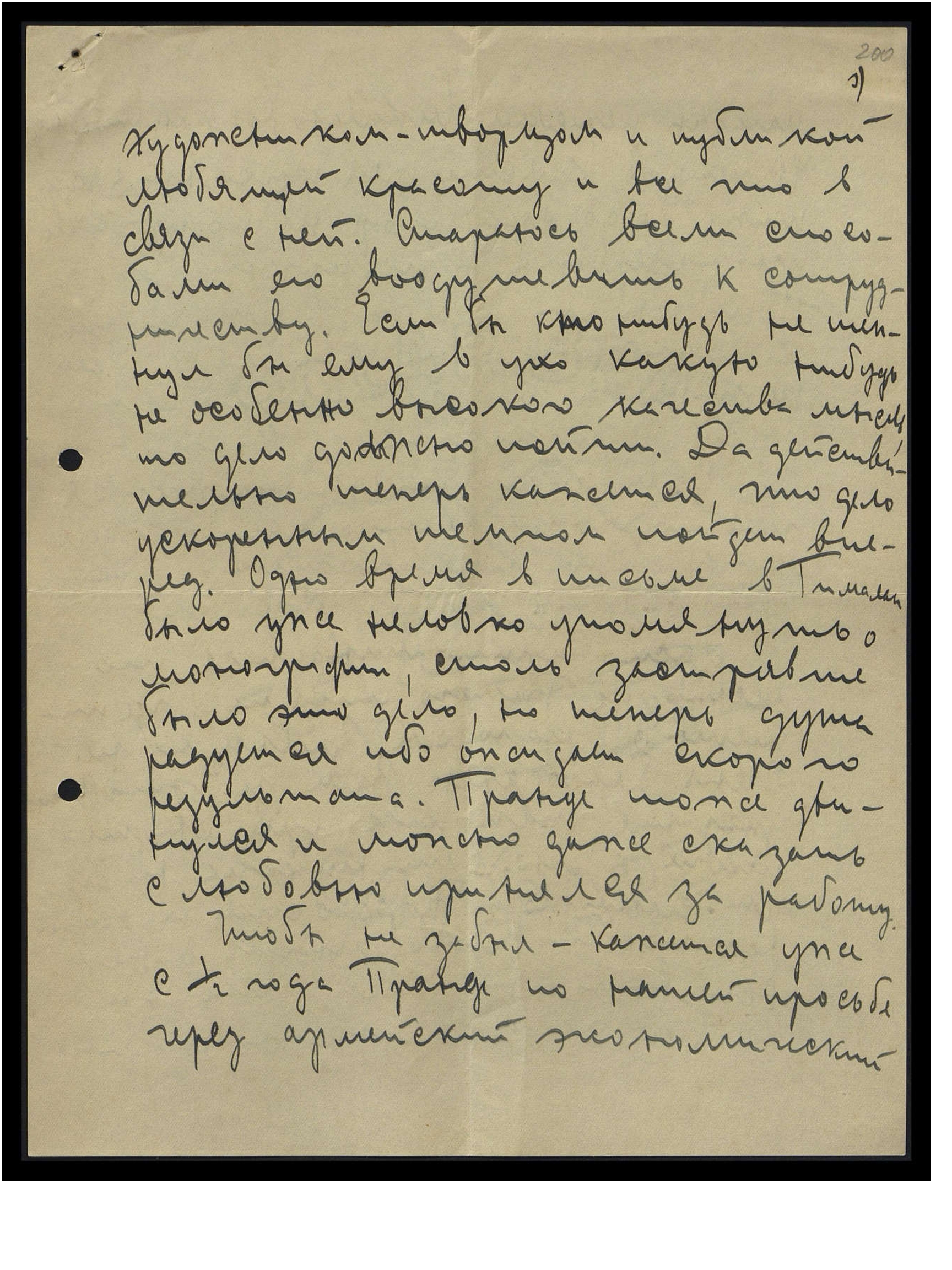 и вопроса о Праге и Чехословакии. Ведь в Праге находились репродукции картин, нужные для монографии, и только на днях они будут пересланы в Ригу, но никогда нам в ум не приходило тревожиться, что могли бы их терять. И когда дотрагивались этого вопроса, то говорили — ведь в Праге есть картины, и посланы ведь они с особым значением — это помощь вовремя народу, находящемуся в тяжёлом положении. Хотя и положение в Мире сейчас тяжёлое, но радуемся, ибо знаем, что исход должен быть благополучным, и от человечества зависит, пойдёт оно более прямым путём или косвенным.