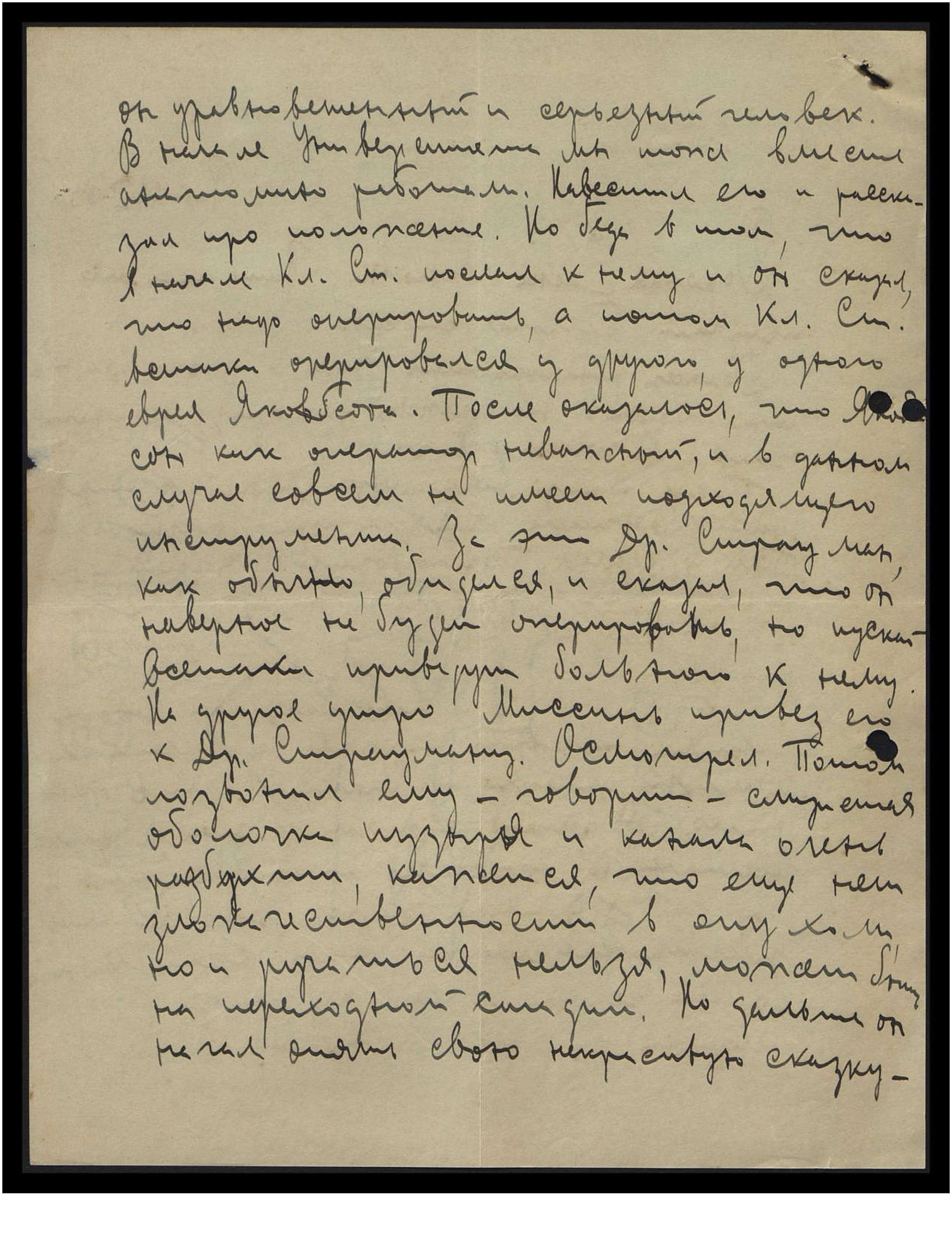 Он уравновешенный и серьёзный человек. Вначале Университета мы тоже вместе анатомию работали. Навестил его и рассказал про положение. Но беда в том, что вначале Кл[леметия] Ст[аниславовича] послал к нему, и он сказал, что надо оперировать, а потом Кл[леметий] Ст[аниславович] всё-таки оперировался у другого, у одного еврея Якобсона. После оказалось, что Якобсонбкак оператор - неважный, и в данном случае совсем не имеет подходящего инструмента. За это Др. Страуман, как обычно, обиделся и сказал, что он, наверное, не будет оперировать, но пускай всё-таки привезут больного к нему. На другое утро Миссинь привёз его к Др. Струману. Осмотрел. Потом позвонил ему [и] говорит — слизистая оболочка пузыря и канала очень разбухши, кажется, что ещё нет злокачественности в опухоли, но и ручаться нельзя, может быть, на переходной стадии. Но дальше он начал опять свою некрасивую сказку,