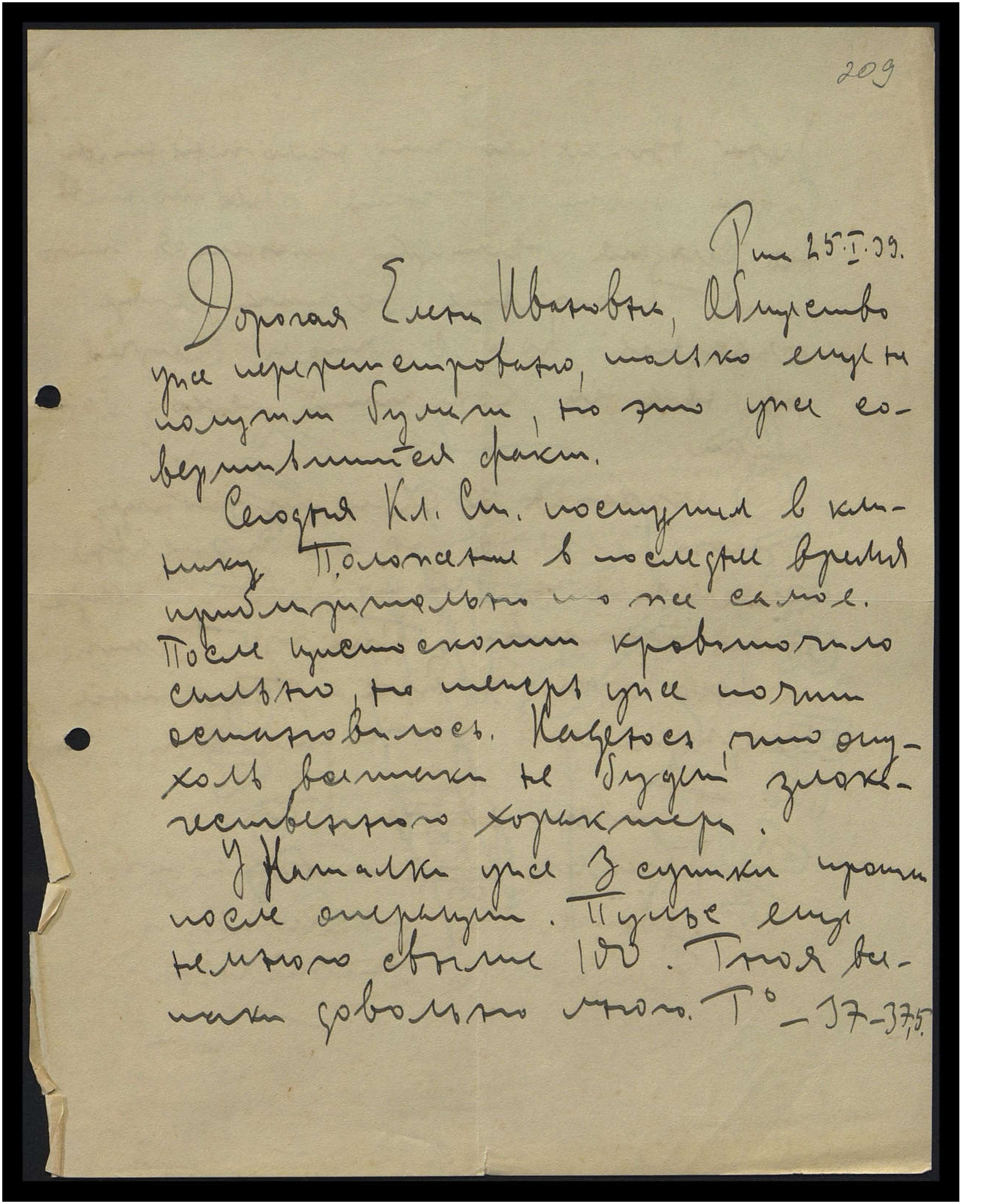 Сегодня Кл[ементий] Ст[аниславович] поступил в клинику. Положение в последнее время приблизительно то же самое. После цистоскопии кровоточило сильно, но теперь уже почти остановилось. Надеюсь, что опухоль всё-таки не будет злокачественного характера.