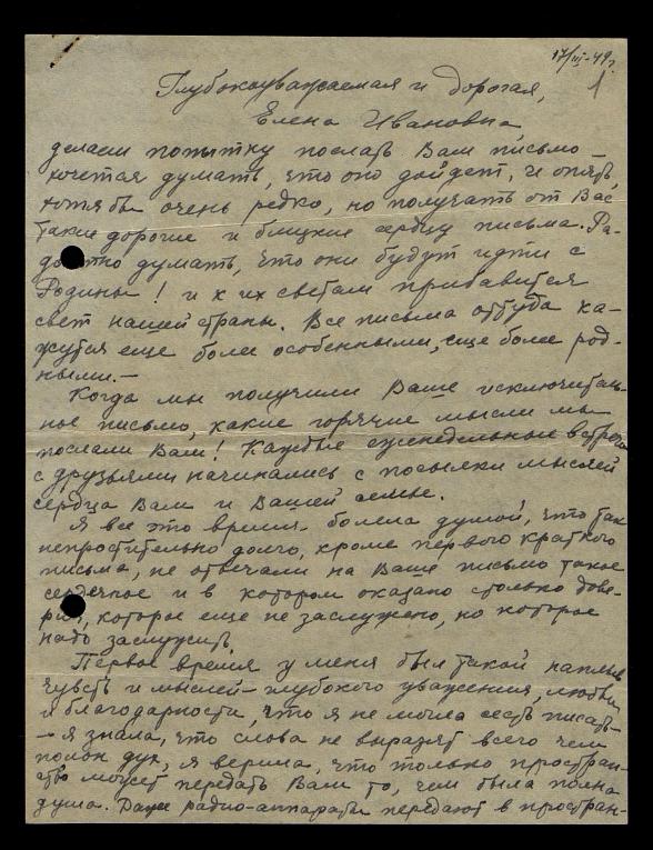 Глубокоуважаемая и дорогая Елена Ивановна, большую радость и приливы счастья принесло нам письмо, полученное из Харбина с выпиской из Вашего письма.