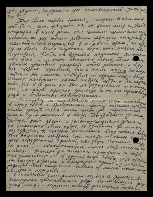 Несмотря на порядочное количество попавших в город бомб и брошенных гранат обеими сторонами, жертв очень мало, среди же европейцев только один раненый в ногу. Пострадали улицы, заборы, окна, двери и только частично дома, на окраинах было хуже, но ожидали во много раз худшего. К счастью населения, вход новых войск был настолько быстрый, что почти не было грабежей окруженной армией, что тоже, конечно, сыграло роль, т.к. отступающая могла быть менее гуманной. Теперь уже плотина прорвана и хотя еще закрывает нас от другой части света, зато открыла самую дорогую и близкую. Одной из личных радостей было получение письма от мамы после почти 3-х летнего перерыва.