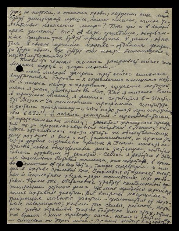 В моей личной жизни идет сейчас сильная внутренняя борьба, к сожалению, слишком поздно я нашла науку и профессию, изучение которой меня, я знаю, захватило бы всю. Как я писала Вам в прошлом письме, я решила готовиться в Институт Мозга. За неимением программы института, я достала программу "Что надо знать при поступлении в ВУЗ" и начала занятия с преподавателем. Я прозанималась месяц, занятия пришлось прекратить из-за предполагавшейся поездки в Пекин, поездка оттягивалась из-за отчета по общественному делу, которое я вела, и которое заканчивалось, и кроме того, из-за других случайных причин. В Пекин поехать не удалось, новые общественные дела затянули, события совсем оторвали от занятий. Сейчас я работаю в Отделе социально-бытовой помощи как секретарь в столовой комиссии при Соц.Быте, также секретарем, и им уже в Активе столовой Ком. Столовая. Столовая отпускает платные и бесплатные обеды, ради последних мы работаем. Кроме того, обстановка требует немедленной организации детского дома, где мне придется принять самое активное участие. Все вопросы насущные и требующие личного участия, уклониться от которых невозможно, кроме того, семья, ребенок, которого, уходя, оставляю только бабушке или отцу, остальное время с ним провожу сама, няню я брать не хочу, слишком он дорог мне. Время уходит без остатка.
