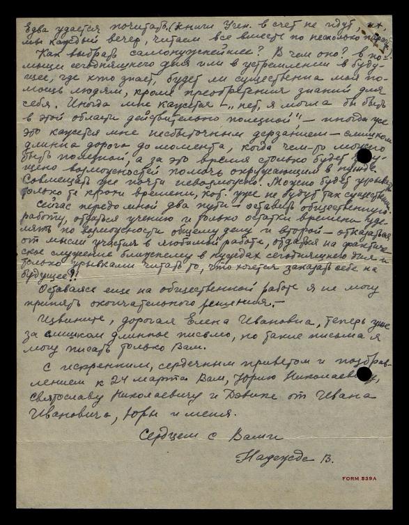 Название, датировка и формат оригинала на сайте ГМР: Письма к Е.И.Рерих Варфоломеева Надежда 1949.03.17 - 1950.05.29 русский Китай, Тянцзин 2 письма