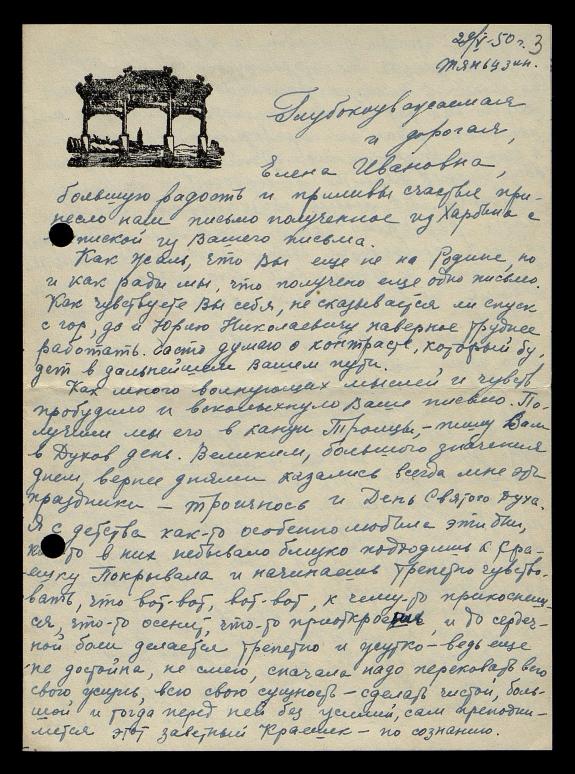 Глубокоуважаемая и дорогая Елена Ивановна, большую радость и приливы счастья принесло нам письмо, полученное из Харбина с выпиской из Вашего письма.