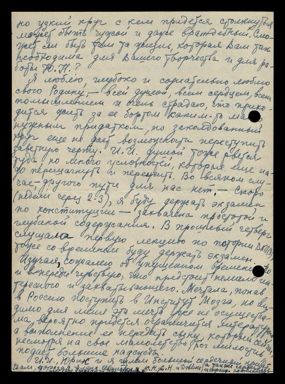 Я люблю глубоко и сознательно, люблю свою Родину, всей душой, всем сердцем, всем помышлением и очень страдаю, что приходится жить за её бортом каким-то мало нужным придатком, но заколдованный круг еще не дает возможности переступить заветную черту. Иван Иванович [Варфоломеев] душой тоже рвется туда, но много условностей, которые еще надо перешагнуть и пережить. Во всяком случае, другого пути для нас нет. Скоро (недели через 2-3) я буду держать экзамен по конституции − захвачена простотой и глубиной содержания. В прошлый четверг слушала первую лекцию по истории ВКП(б). Изучая, сожалею об упущенном времени. Но и впереди чувствую, что предстоит немало интересного и захватывающего. Мечтала, попав в Россию, поступить в Институт Мозга, но, видимо, для меня эта мечта уже неосуществима, вероятно, придется ограничиться литературой, а выполнение её передать сыну, который сейчас, несмотря на свое малолетство, Бог милостив, подает большие надежды.