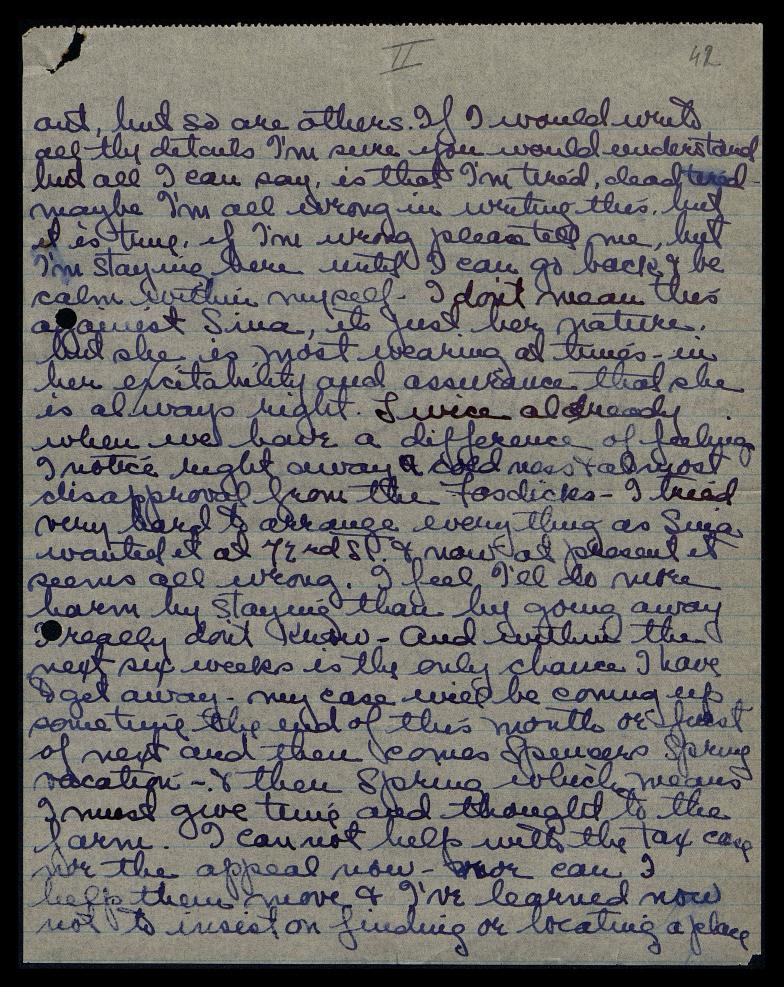 out, but so are others. If I wrote all the details, I’m sure you would understand, but all I can say is that I’m tired, dead tired. Maybe I’m all wrong in writing this, but it is true. If I’m wrong, please tell me, but I’m staying here until I can go back and be calm within myself. I don’t mean this against Sina, it’s just her nature, but she is most wearing at times in her excitability and assurance that she is always right. Twice already when we have a difference of feeling, I notice right away a coldness and almost disapproval from the Fosdicks. I tried very hard to arrange everything as Sina wanted it at 72nd Street, and now at present, it seems all wrong. I feel I’ll do more harm by staying there than by going away. I really don’t know, and within the next six weeks is the only chance I have to get away.