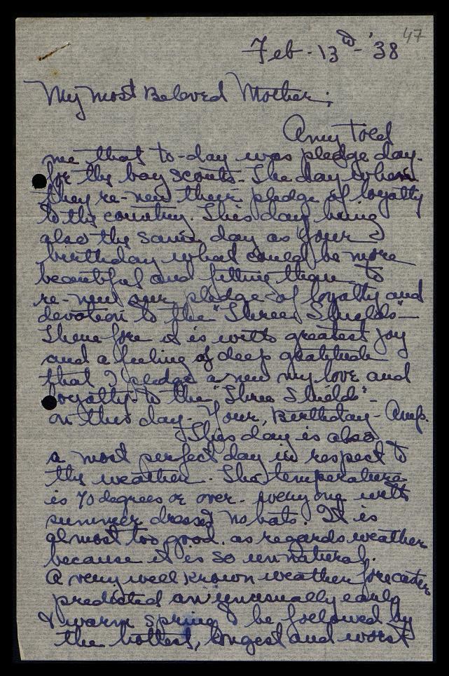Amy told me that today was pledge day for the Boy Scouts. The day when they renew their pledge of loyalty to the country. This day being also the same day as your birthday, what could be more beautiful and fitting than to renew our pledge of loyalty and devotion to the “Three Shields.” Therefore, it is with the greatest joy and a feeling of deep gratitude that I pledge anew my love and loyalty to the “Three Shields” on this day, your birthday—Amrida.