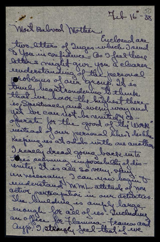 Enclosed are two letters of Inge’s, which I send to you in confidence, as I feel these letters might give you a clearer understanding of the personal problems of our group. It is truly heart-rendering to think that we have the highest there is, spiritually, and in every way, and yet we cannot be united and cooperate for the good of the “Work” instead of our personal likes and dislikes. Keeping us at odds with one another. I really dread going back into this seeming impossibility of disunity. It is all so very, very unnecessary.