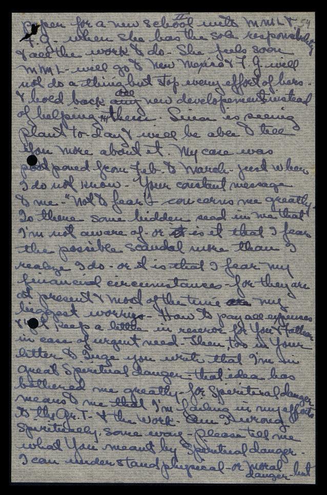 My case was postponed from February to March, just when, I do not know. Your constant message to me “not to fear” concerns me greatly. Is there some hidden seed in me that I’m not aware of, or is it that I fear the possible scandal more than I realize I do, or is it that I fear my financial circumstances, for they are at present and most of the time my biggest worries? How to pay all expenses and yet keep a little in reserve for You and Father in case of urgent need. Then, too, in Your letter to Inge, you write that I’m in great spiritual danger. That idea has bothered me greatly for spiritual danger means to me that I’m failing in my efforts to the Gr[eat] T[eacher] and the “Work.” Am I wrong spiritually in some ways? Please tell me what You meant by spiritual danger. I can understand physical or moral danger, but