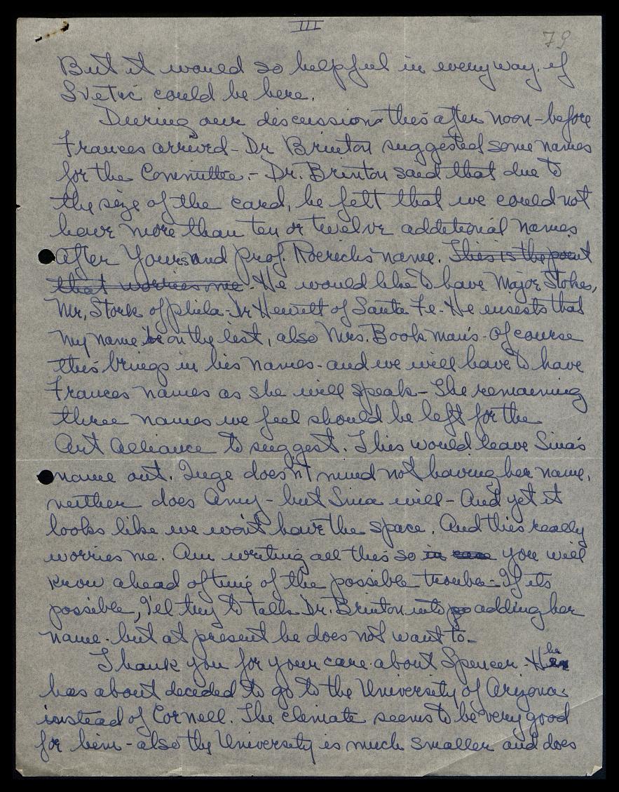 During our discussions this afternoon, before Frances arrived, Dr. Brinton suggested some names for the committee. Dr. Brinton said that due to the size of the card, he felt that we could not have more than ten or twelve additional names after yours and Prof. Roerich’s name. He would like to have Major Stokes, Mr. Stork of Philadelphia [USA], and Dr. Hewitt of Santa Fe [USA]. He insists that my name be on the list, also Mrs. Bookman’s. Of course, this brings in his name, and we will have to have Frances’ name, as she will speak. The remaining three names we feel should be left for the Art Alliance to suggest. This would leave Sina’s name out. Inge doesn’t mind not having her name and neither does Amy, but Sina will. And yet it looks like we won’t have the space, and this really worries me. I am writing all this so you will know ahead of time of the possible trouble. If it’s possible, I’ll try to talk Dr. Brinton into adding her name, but at present, he does not want to.
