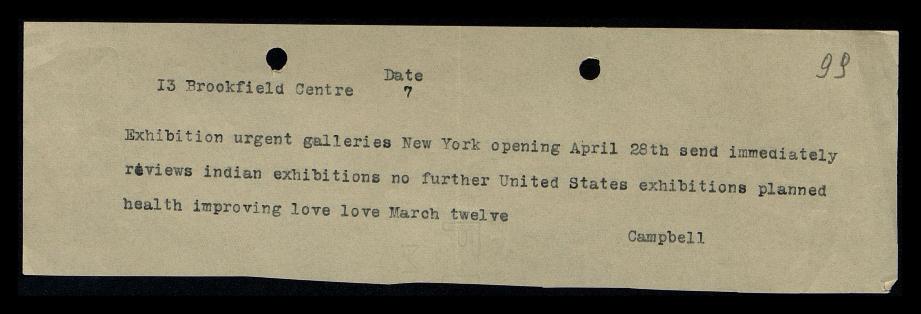 Exhibition urgent galleries New York opening April 28th send immediately reviews—Indian exhibitions no further United States exhibitions planned health improving.