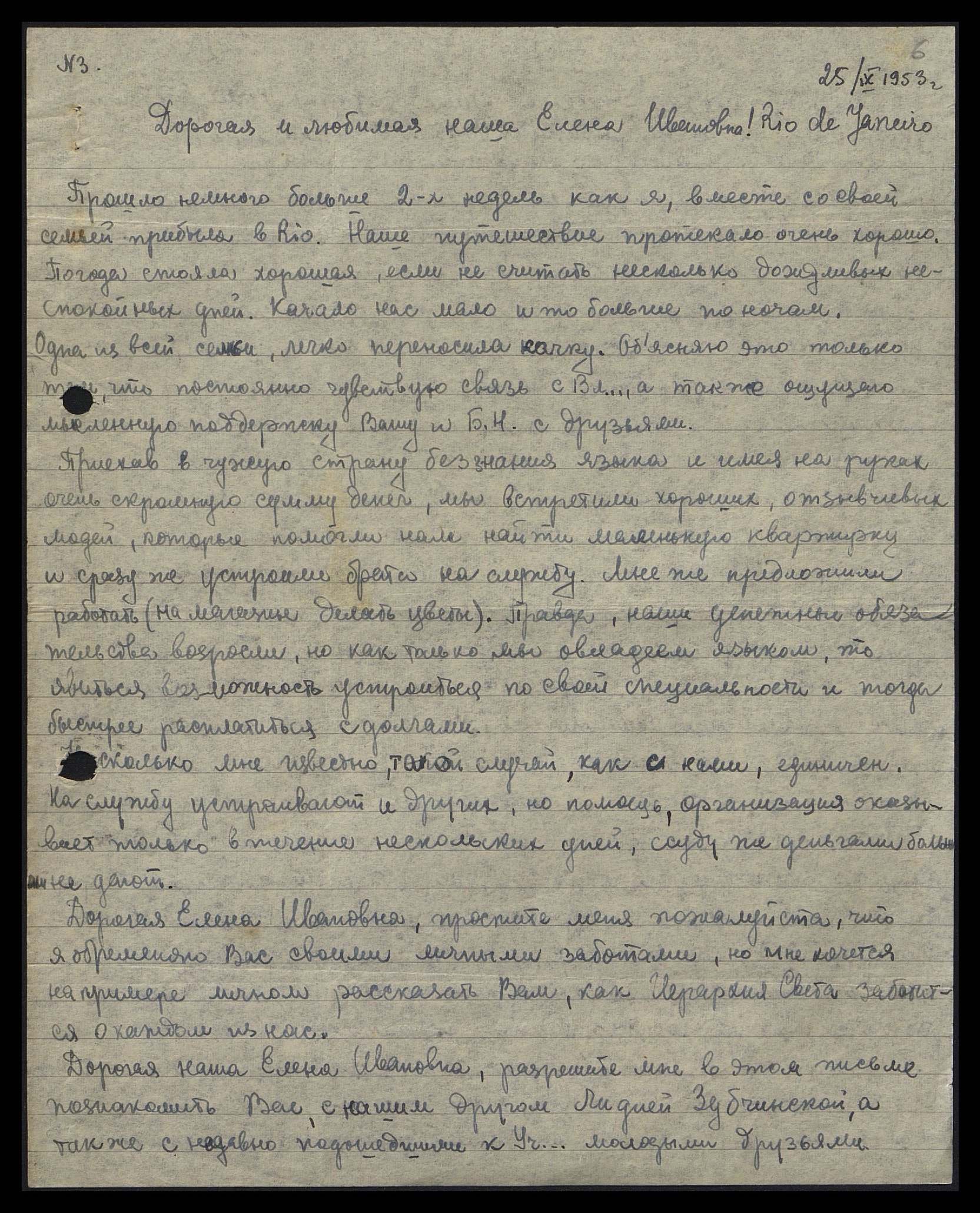 Прошло немного больше 2-х недель, как я вместе со своей семьёй прибыла в Rio. Наше путешествие протекало очень хорошо. Погода стояла хорошая, если не считать несколько дождливых неспокойных дней. Качало нас мало и то больше по ночам. Одна из всей семьи легко переносила качку. Объясняю это только тем, что постоянно чувствую связь с Вл[адыкой], а также ощущаю мысленную поддержку Вашу и Бориса Николаевича [Абрамова] с друзьями.