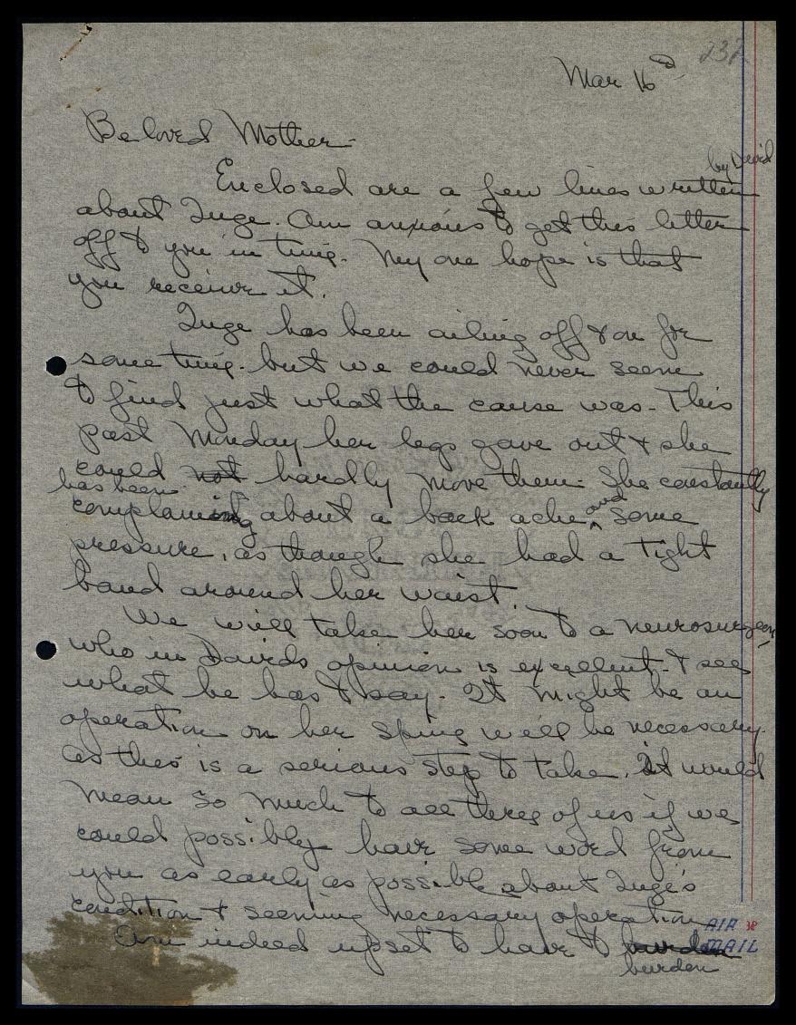 Mother dear, if an operation is necessary, do you think you could cable us the best time as to the month to have it performed? It would be at the Stamford Hospital and David would be there to help take care of her. Of course, I would also be nearby.