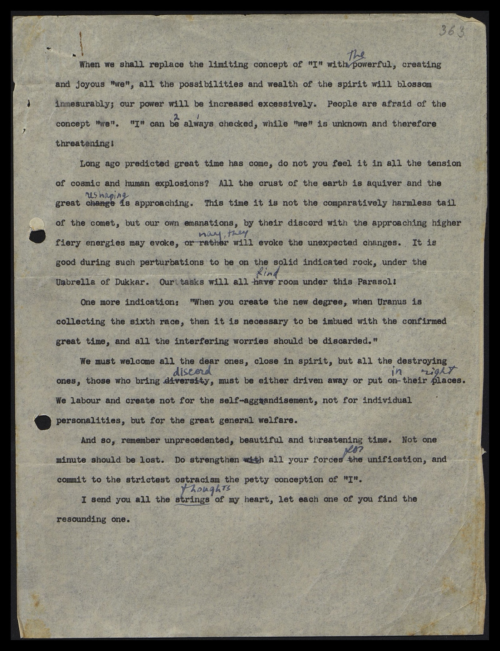 We must welcome all the dear ones, close in spirit, but all the destroying ones, those who bring discord, must be either driven away or put in their right places. We labour and create not for the self-aggzandisement, not for individual personalities, but for the great general welfare.