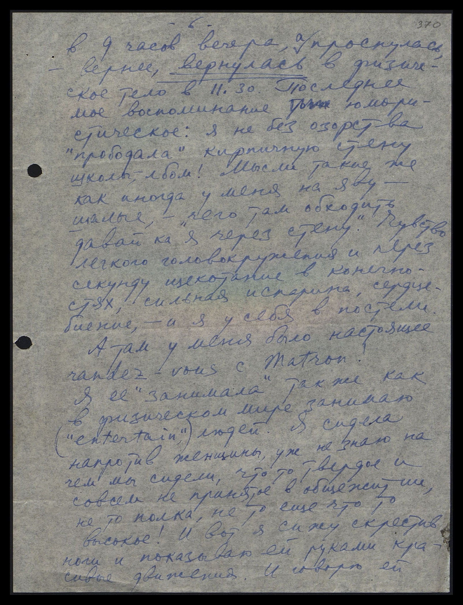 в 9 часов вечера, а проснулась, вернее, вернулась в физическое тело в 11.30. Последнее моё воспоминание — юмористическое: я не без озорства "прободала" кирпичную стену школы лбом! Мысли такие же, как иногда у меня наяву — шалые: "Чего там обходить, давай-ка я через стену". Чувство лёгкого головокружения и через секунду щекотание в конечностях, сильная испарина, сердцебиение — и я у себя в постели. А там у меня было настоящее randez-vous с Matron [англ.: рандеву с Матроной]!