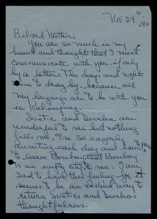 Svetic and Devika are wonderful to me but nothing fills me. I’m so eagerly awaiting each day and hour to pass to leave Bombay [India] that Bombay is an empty city to me. I am sad to have this feeling for it seems to be an unkind way to return Svetic and Devika’s thoughtfulness.
