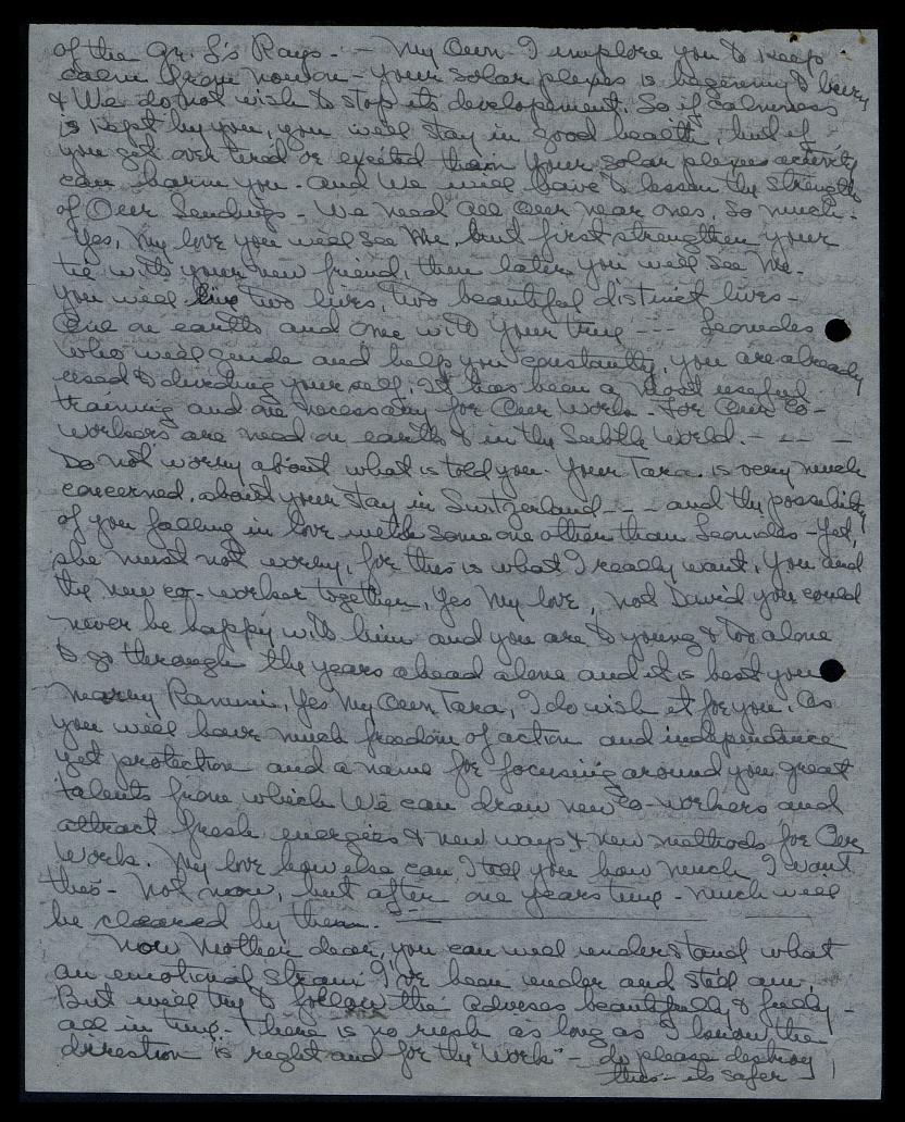 [англ.: он под Лучом В[еликого] Вл[адыки]. Моя дорогая, я умоляю тебя с этого момента сохранять спокойствие. Твоё солнечное сплетение начинает возгораться, и мы не хотим останавливать его развитие. Итак, если ты будешь сохранять спокойствие, то сохранишь своё здоровье, но если ты будешь переутомляться или возбуждаться, то активность твоего солнечного сплетения может навредить тебе, и нам придется уменьшить силу наших посылок. Мы так нуждаемся во всех наших близких. Да, любовь моя, ты увидишь Меня, но сначала укрепи свои отношения со своим новым другом, а потом ты увидишь Меня. Ты проживёшь две жизни. Две прекрасные, разные жизни. Одну на Земле и одну с твоим истинным Леонидесом, который будет постоянно направлять и помогать тебе. Ты уже привыкла разделять себя. Это очень полезная тренировка, необходимая для нашей Работы, которой наши сотрудники пользуются на Земле и в Тонком Мире. Не беспокойся о том, что тебе говорят. Твоя Тара очень обеспокоена твоим пребыванием в Швейцарии... и возможностью того, что ты влюбишься в кого-то другого, кроме Леонидеса. Но она не должна беспокоиться за то, чего я действительно хочу. Ты будешь с новым сотрудником вместе, да, любовь моя, не с Дэвидом [Фогелем] — ты никогда не сможешь быть счастлива с ним, и ты слишком молода и одинока, чтобы прожить предстоящие годы в одиночестве, и будет лучше, если ты выйдешь замуж за Рамини. Да, Моя Родная Тара, я искренне желаю тебе этого. Поскольку у тебя будет большая свобода действий и независимость, но в то же время защита и имя, позволяющие сосредоточить вокруг тебя выдающиеся таланты, из которых мы сможем привлечь новых сотрудников и свежую энергию, новые пути и методы для нашей работы. Любовь моя, как ещё я могу передать тебе, как сильно я этого хочу? Не сейчас, но через год, к тому времени многое прояснится.