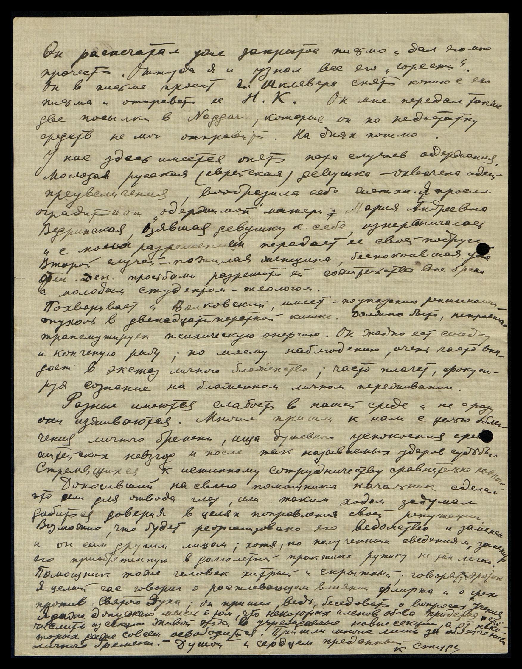 Он распечатал уже закрытое письмо и дал его мне прочесть. Оттуда я и узнал все его "горести". Он в письме просит г. Шклявера снять копию с его письма и отправить его Н.К. Он мне передал также две посылки в Naggar, которые он по недостатку средств не мог отправить. На днях пошлю.