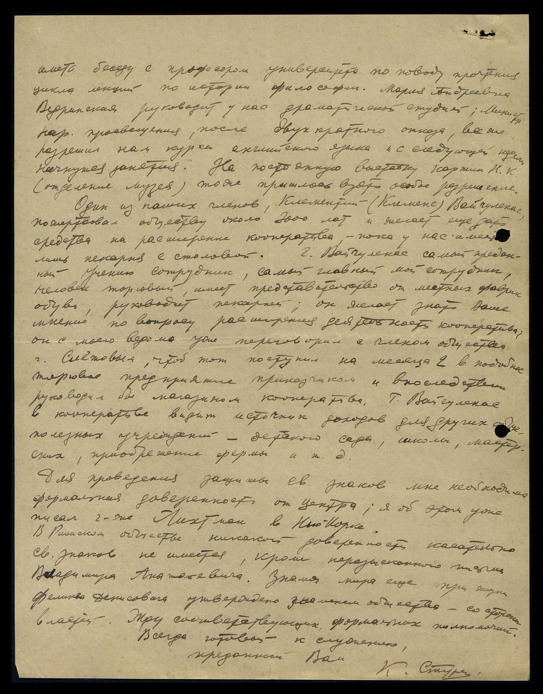 У нас сейчас условия неблагоприятные для основания новых организаций; многие существующие закрываются как нежелательные; я пока получаю разрешение на заседания секций и на чтение рефератов, благодаря личным знакомствам и престижу общества имени Н.К.
