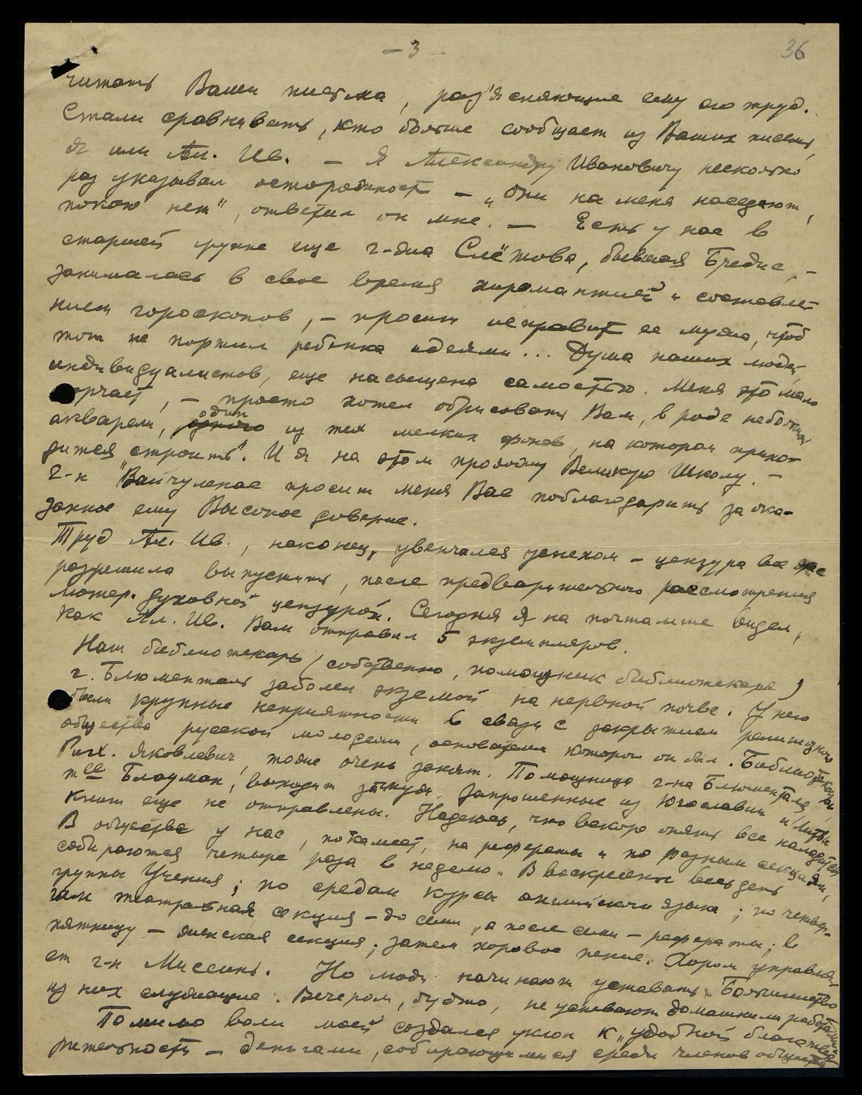 Наш библиотекарь (собственно, помощник библиотекаря), г. Блюменталь, заболел экземой на нервной почве. У него были крупные неприятности в связи с закрытием религиозного общества русской молодёжи, основателем которого он был. Библиотекарь Рихард Яковлевич [Рудзитис] тоже очень занят. Помощница г-на Блюменталя, м. Блауман, выходит замуж. Запрошенные из Югославии и Литвы книги ещё не отправлены. Надеюсь, что вскоре опять всё наладится. В Обществе у нас, покамест, на рефераты и по разным секциям, собираются четыре раза в неделю. В воскресенье весь день группы Учения; по средам — курсы английского языка; по четвергам — театральная секция до семи, а после семи — рефераты; в пятницу — женская секция; затем - хоровое пение. Хором управляет г-н Миссинь. Но люди начинают уставать. Большинство из них служащие. Вечером, будто, не успевают домашними работами. Помимо воли моей создался уклон к "удобной благотворительности" - деньгами, собирающимися среди членов общества