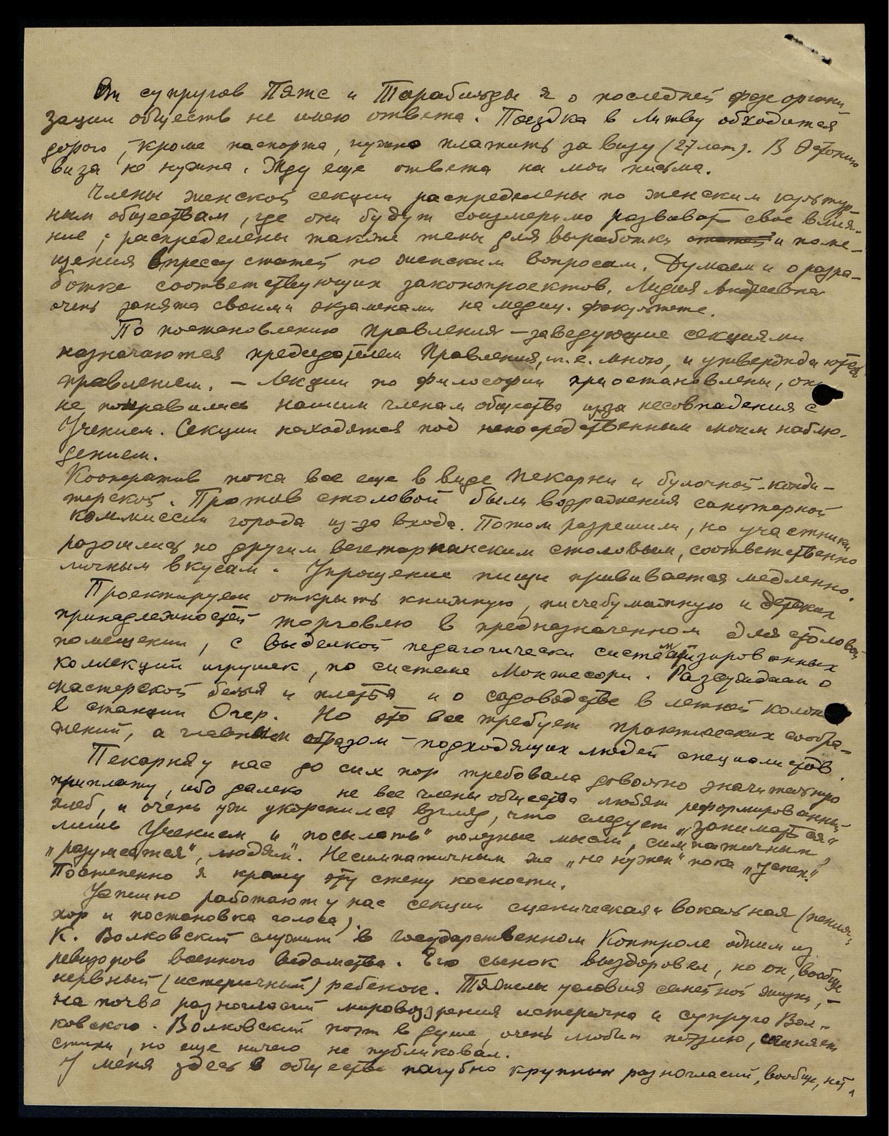 Отсутствуют из групповых заседаний супруги Иогансоны и м. Кесберг. Они все очень заняты. М. Кесберг должна была написать Вам письмо. У неё здесь возник вопрос бракосочетания, кажется, с немецким бароном. Инженер Иогансон зарабатывает средства для жизни на двух должностях, утром - на фабрике, вечером - в школе. Г-н Иогансон в очень значительной доле ещё позитивист и аналитический интеллектуал; он опасается усиления власти председателя, пожелал даже изменение устава в сторону ограничения власти правления и расширения прав общего собрания. Ему и г-же М[исинь] не пришлось по вкусу моё избрание председателем. Теперь они, кажется, почти примирились.