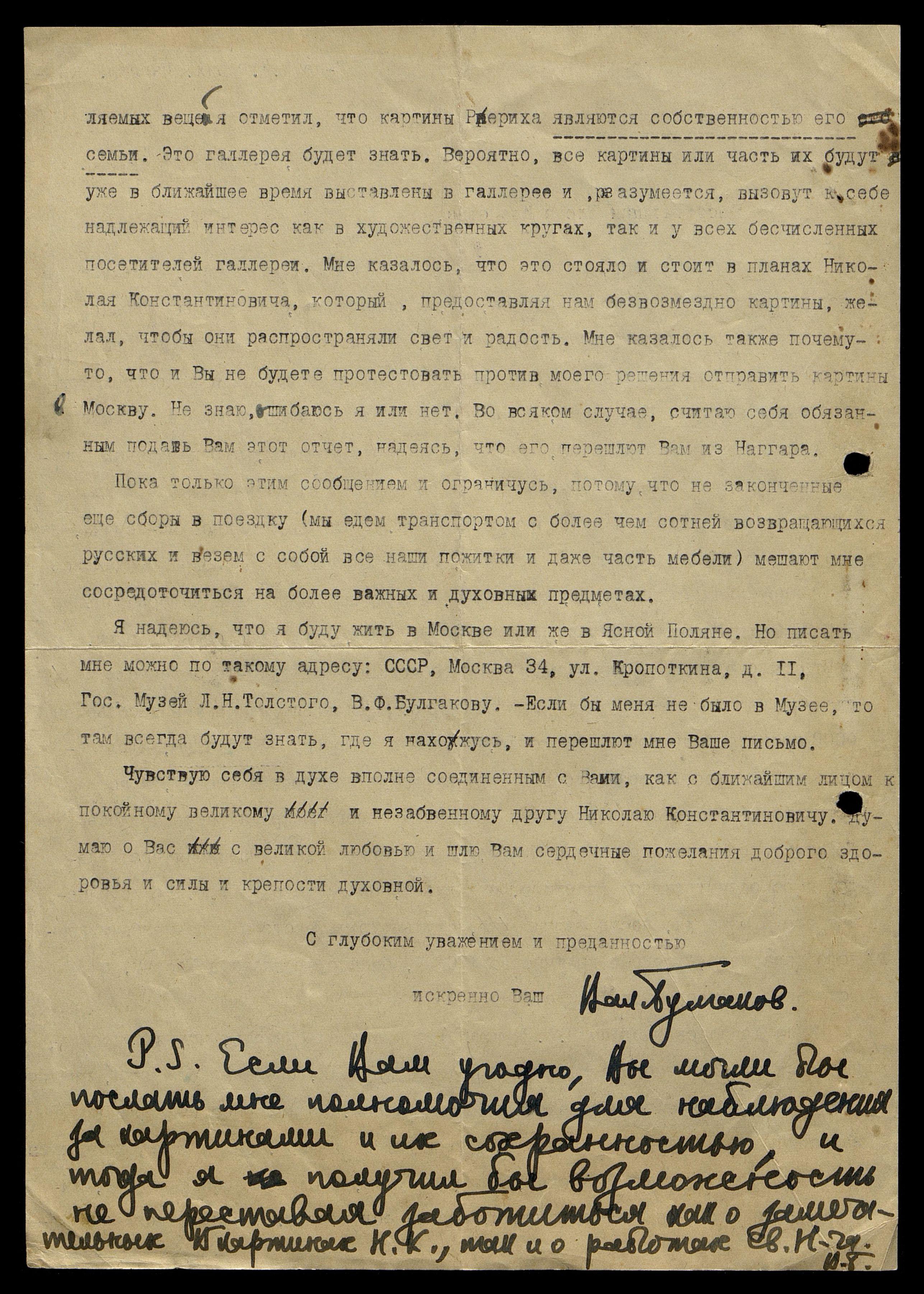 P.S. Если Вам угодно, Вы могли бы послать мне полномочия для наблюдения за картинами и их сохранностью, и тогда я получил бы возможность не переставая заботиться как о замечательных картинах Н[иколая] К[онстантиновича] так и о работах Св[ятослава] Н[иколаевича].