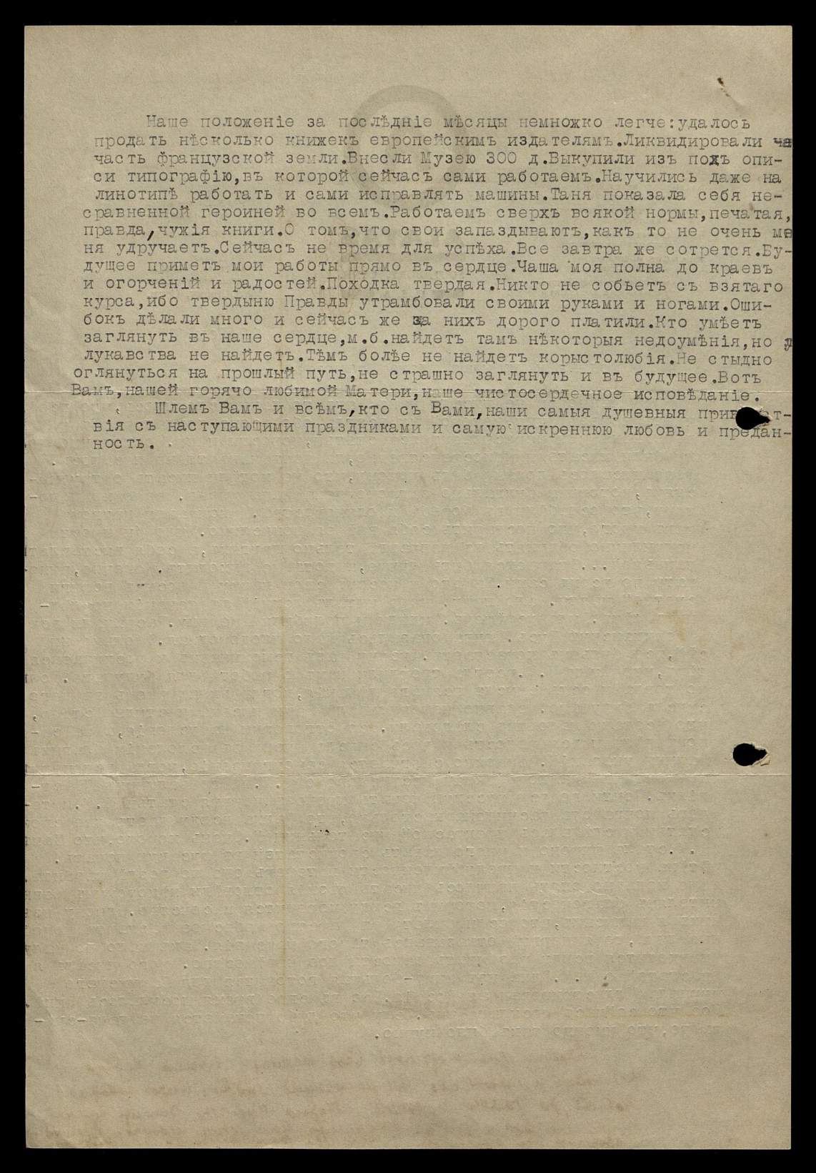 Наше положение за последние месяцы немножко легче: удалось продать несколько книжек европейским издателям. Ликвидировали часть французкой земли. Внесли Музею 300 долларов. Выкупили из-под описи типографию, в которой сейчас сами работаем. Научились даже на линотипе работать и сами исправлять машины. Таня показала себя несравненной героиней во всём. Работаем сверх всякой нормы, печатая, правда, чужие книги. О том, что свои запаздывают, как-то не очень меня удручает. Сейчас не время для успеха. Всё завтра же сотрётся. Будущее примет мои работы прямо в сердце. Чаша моя полна до краёв и огорчений, и радостей. Походка твёрдая. Никто не собьёт с взятого курса, ибо твердыню Правды утрамбовали своими руками и ногами. Ошибок делали много и сейчас же за них дорого платили. Кто умеет заглянуть в наше сердце, может быть, найдёт там некоторые недоумения, но лукавства не найдёт. Тем более не найдёт корыстолюбия. Не стыдно оглянуться на прошлый путь, не страшно заглянуть и в будущее. Вот Вам, нашей горячо любимой Матери, наше чистосердечное исповедание.