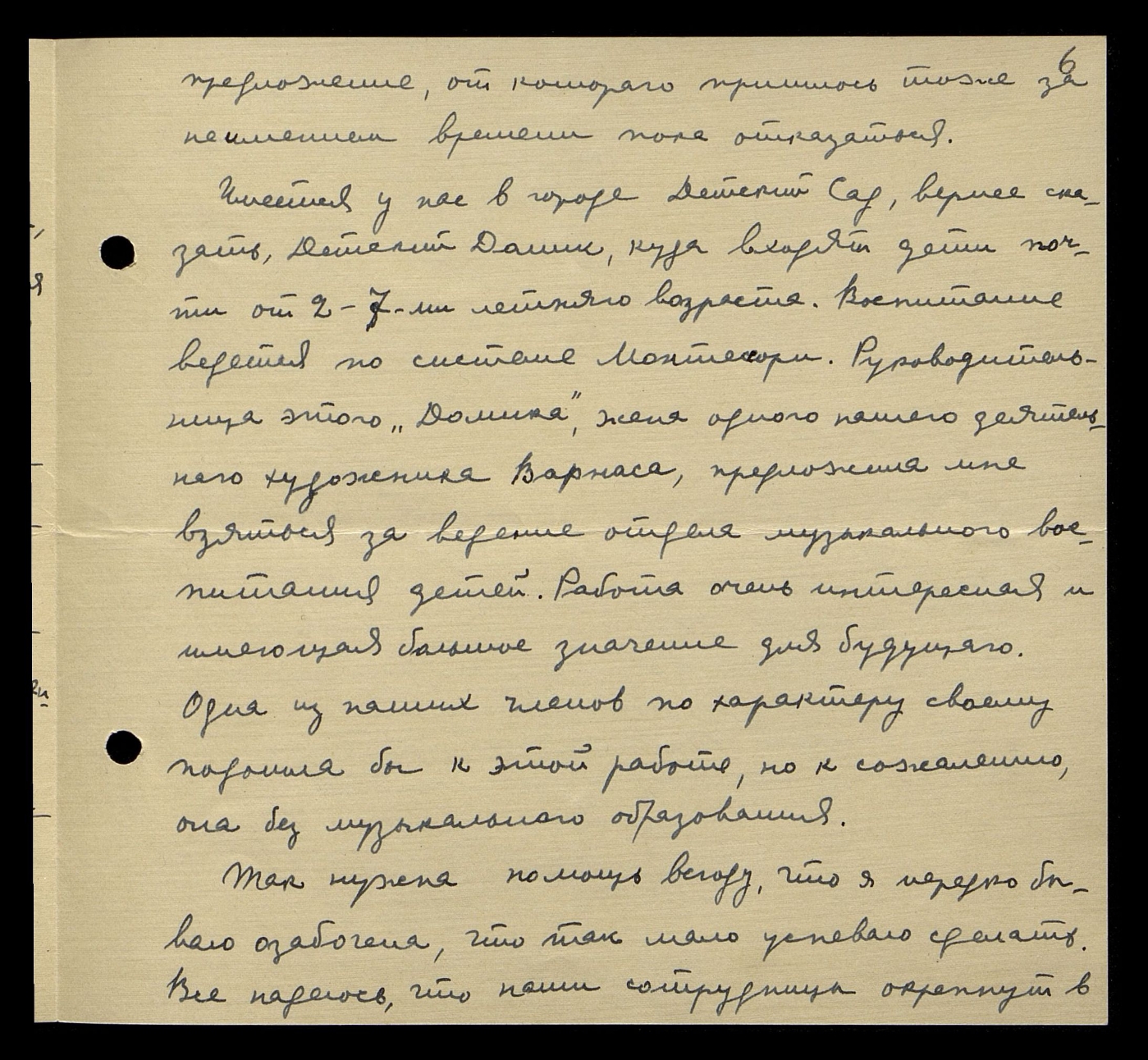 Имеется у нас в городе Детский Сад, вернее сказать, Детский Домик, куда входят дети почти от 2-7-милетнего возраста. Воспитание ведётся по системе Монтессори. Руководительница этого "Домика", жена одного нашего деятельного художника Варнаса, предложила мне взяться за ведение отдела музыкального воспитания детей. Работа очень интересная и имеющая большое значение для будущего. Одна из наших членов по характеру своему подошла бы к этой работе, но к сожалению, она без музыкального образования.