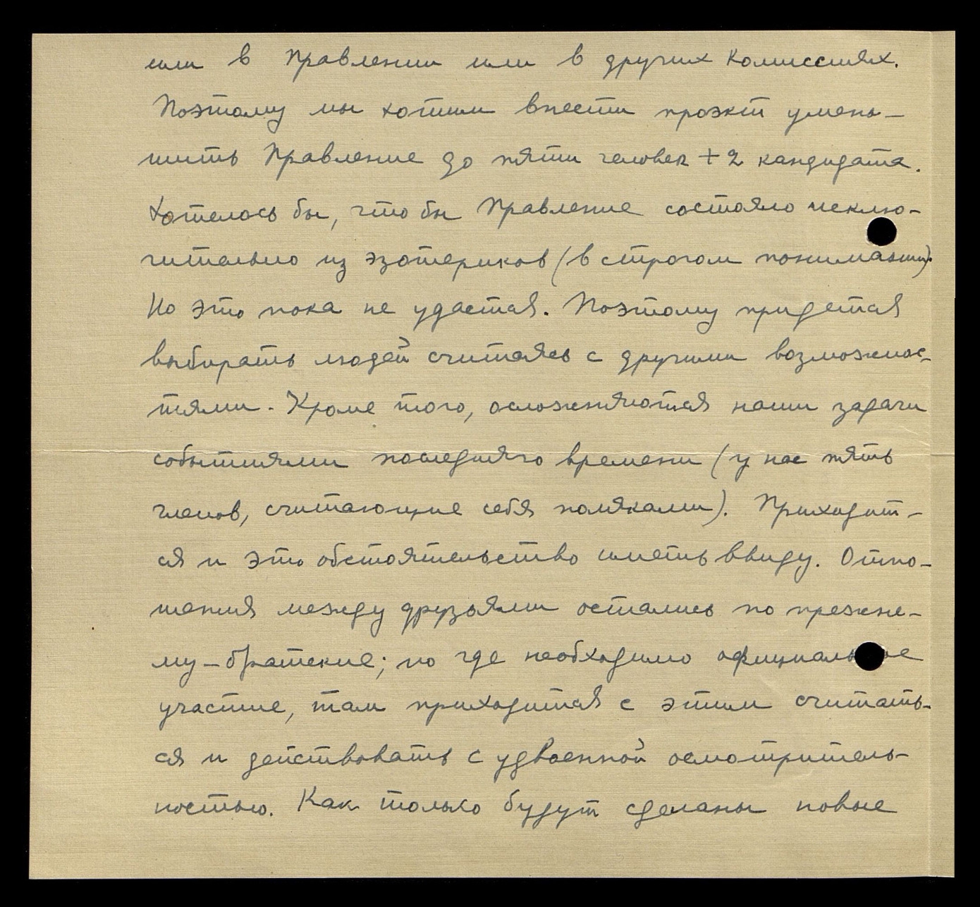 Поэтому мы хотим внести проект уменьшить Правление до пяти человек +2 кандидата. Хотелось бы, чтобы Правление состояло исключительно из эзотериков (в строгом понимании). Но это пока не удастся. Поэтому придётся выбирать людей, считаясь с другими возможностями. Кроме того, осложняются наши задачи событиями последнего времени (у нас пять членов, считающие себя поляками). Приходится и это обстоятельство иметь ввиду. Отношения между друзьями остались по-прежнему — братские; но где необходимо официальное участие, там приходится с этим считаться и действовать с удвоенной осмотрительностью. Как только будут сделаны новые