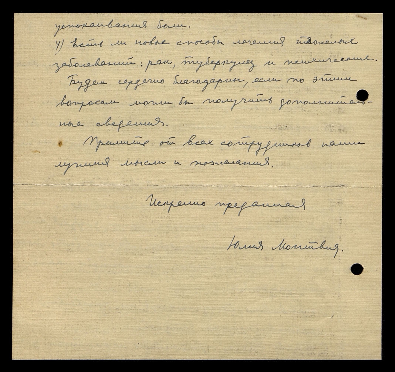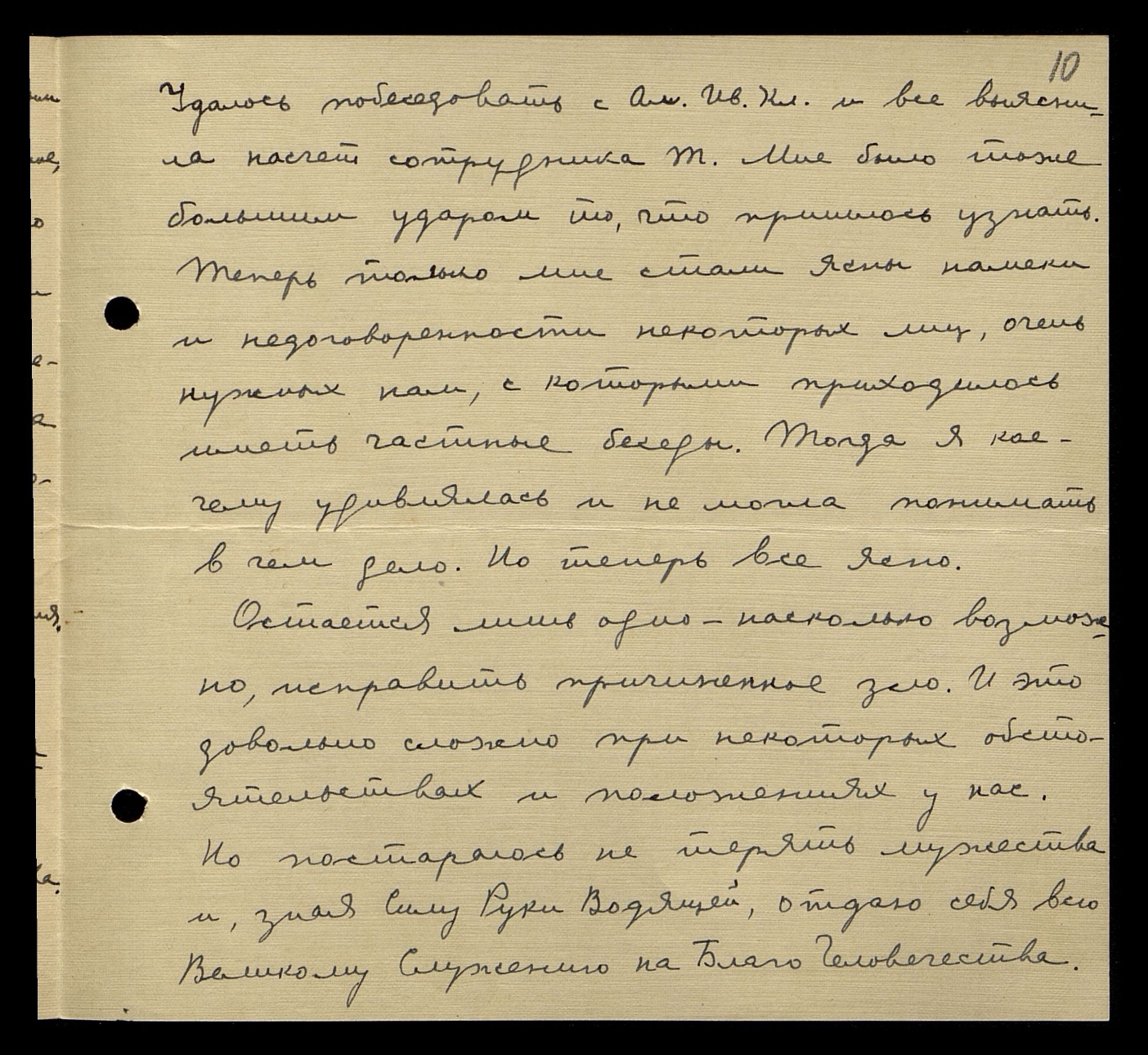 будущем и тогда смогут кое-где меня заменить, а то теперь приходится самой участвовать во всех других организациях, с которыми наше общество поддерживает контакт. А это отнимает не мало времени. И притом много уроков музыки, кот[орые] даю, и всякие репетиции — исчерпывают силы. Иногда кладу все усилия, чтобы не терять радость и бодрость духа, кот[орые] постоянно нужно поддерживать среди наших сотрудников. В тяжёлые минуты мысленно всегда к Вам обращаюсь, тогда получаю много духовных сил, чтоб работать дальше. Помимо всех страданий, кот[орые], очевидно, неизбежны в этой жизни, нахожу большую радость в работе. Всем своим существом понимаю и знаю, из какого Источника посылается нам эта Великая Радость, поэтому безграничною благодарностью переполнено сердце моё.