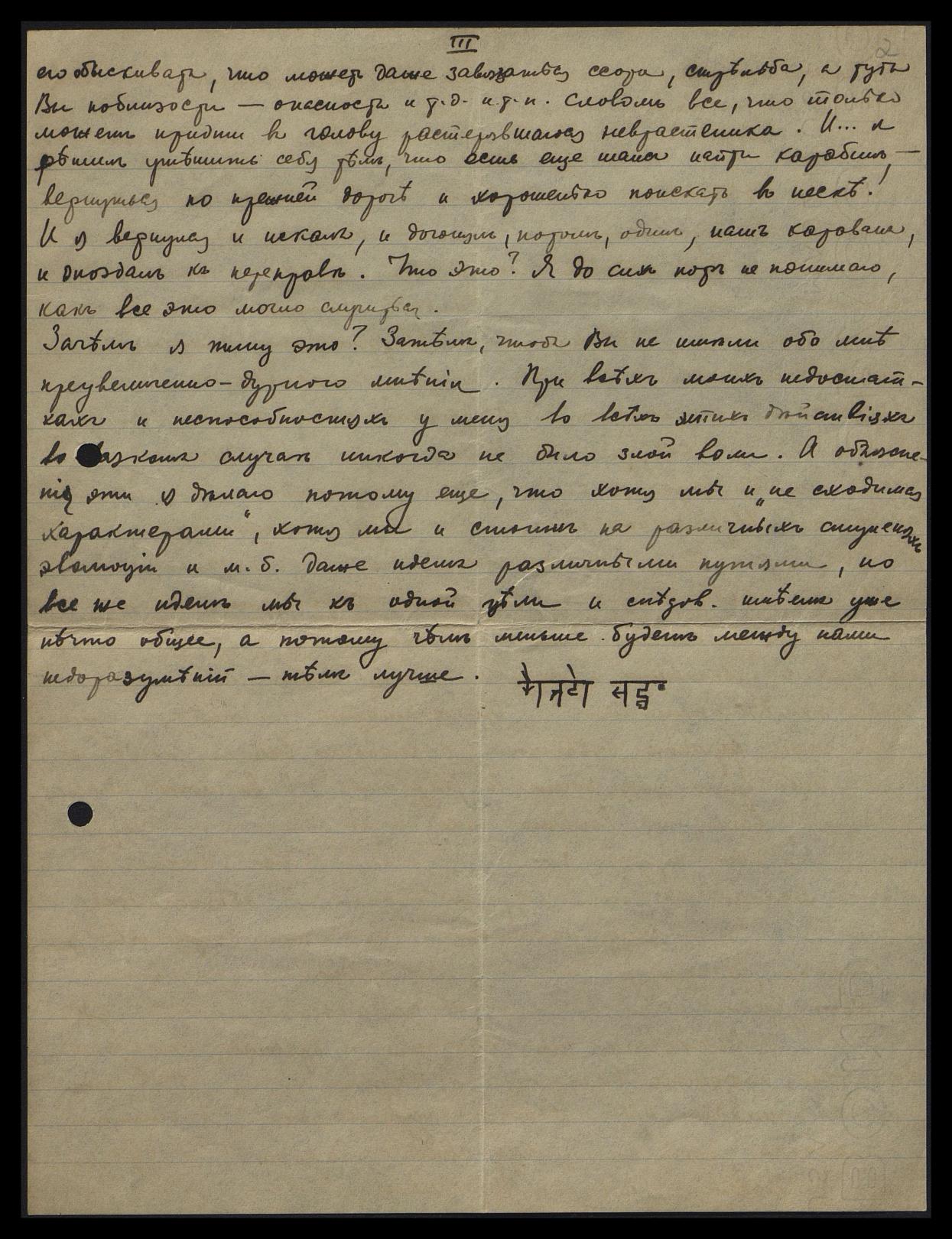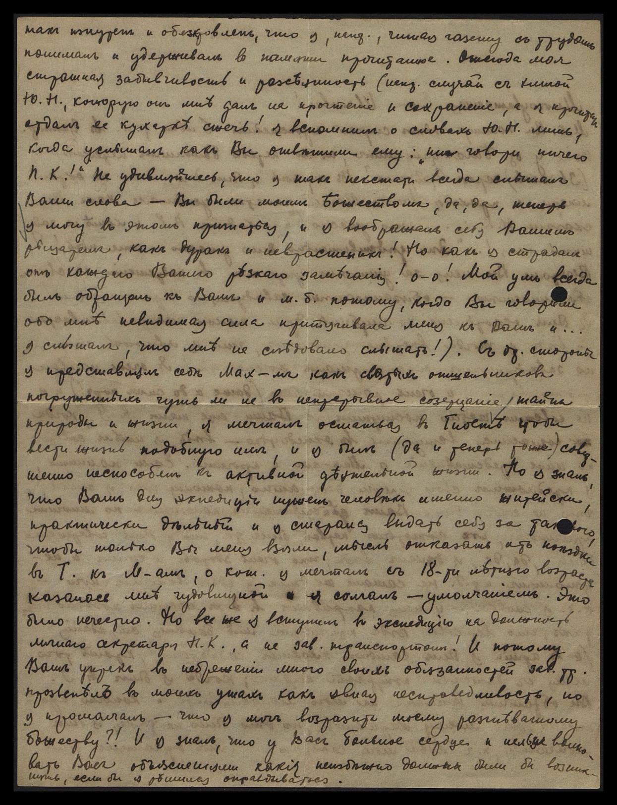 С од[ной] стороны я представлял себе Мах[ат]м как святых отшельников, погружённых чуть ли не в непрерывное созерцание тайны природы и жизни. Я мечтал остаться в Тибете, чтобы вести жизнь, подобную им, и я был (да и теперь тоже) совершенно не способен к активной деятельной жизни. Но я знал, что Вам для экспедиции нужен человек именно житейски, практически дельный и я старался выдать себя за такового, чтобы только Вы меня взяли. Мысль отказать от поездки в Т[ибет] к М[ахатм]ам, о кот[орых] я мечтал с 18-тилетнего возраста казалась мне чудовищной, и я солгал — умолчанием. Это было нечестно. Но всё же я вступил в экспедицию на должность личного секретаря Н[иколая] К[онстантиновича], а не зав[едующего] транспортом! И потому Ваш упрёк в небрежении мною своих обязанностей зав[едующего] тр[анспортом] прозвенел в моих ушах как явная несправедливость, но я промолчал — что я мог возразить моему разгневанному божеству?! И я знал, что у Вас больное сердце и нельзя волновать Вас объяснениями, какие неизбежно должны были бы возникнуть, если бы я решился оправдываться.