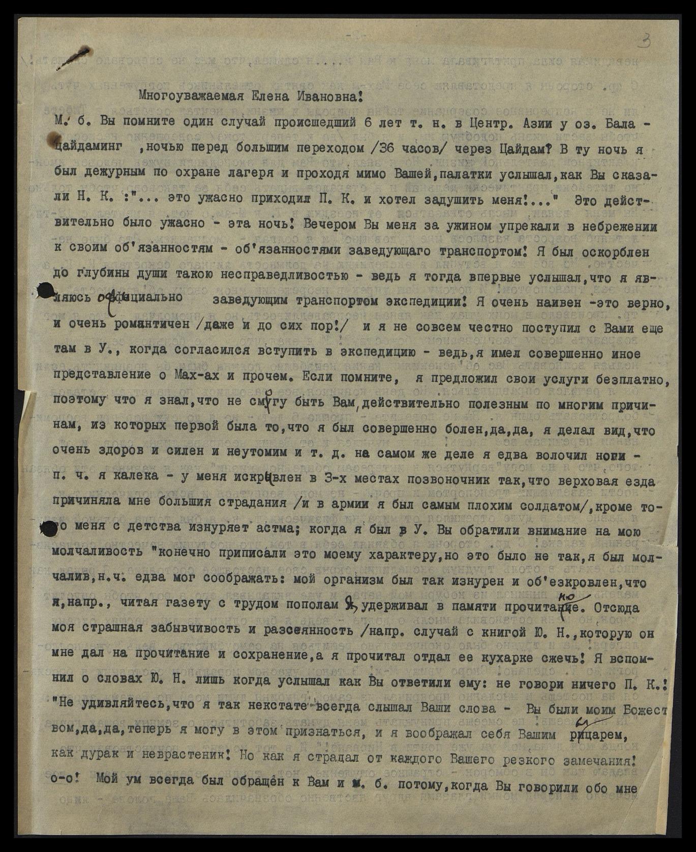 М[ожет] б[ыть] Вы помните один случай, происшедший 6 лет т[ому] н[азад] в Центр[альной] Азии у оз[ера] Бага-цайдаминг, ночью перед большим переходом (36 часов) через Цайдам? В ту ночь я был дежурным по охране лагеря и, проходя мимо Вашей палатки, услышал, как Вы сказали Н[иколаю] К[онстантиновичу]: "... это ужасно! Приходил П[авел] К[онстантинович] и хотел задушить меня!.." Это действительно было ужасно — эта ночь! Вечером Вы меня за ужином упрекали в небрежении к своим обязанностям — обязанностям заведующего транспортом! Я был оскорблён до глубины души такою несправедливостью, ведь я тогда впервые услышал, что я являюсь официально заведующим транспортом экспедиции! Я очень наивен, это верно, и очень романтичен (даже и до сих пор!), и я не совсем честно поступил с Вами ещё там в У[рге], когда согласился вступить в экспедицию, ведь я имел совершенно иное представление о Мах[атм]ах и прочем. Если помните, я предложил свои услуги бесплатно, потому что я знал, что не смогу быть Вам действительно полезным по многим причинам, из которых первая была та, что я был совершенно болен, да, да, я делал вид, что очень здоров и силён, и неутомим и т.д. На самом же деле я едва волочил ноги, п[отому] ч[то] я — калека, у меня искривлён в 3-х местах позвоночник так, что верховая езда причиняла мне большие страдания (и в армии я был самым плохим солдатом), кроме того меня с детства изнуряет астма; когда я был в У[рге], Вы обратили внимание на мою молчаливость и, конечно, приписали это моему характеру, но это было не так, я был молчалив, п[отому] ч[то] едва мог соображать: мой организм был