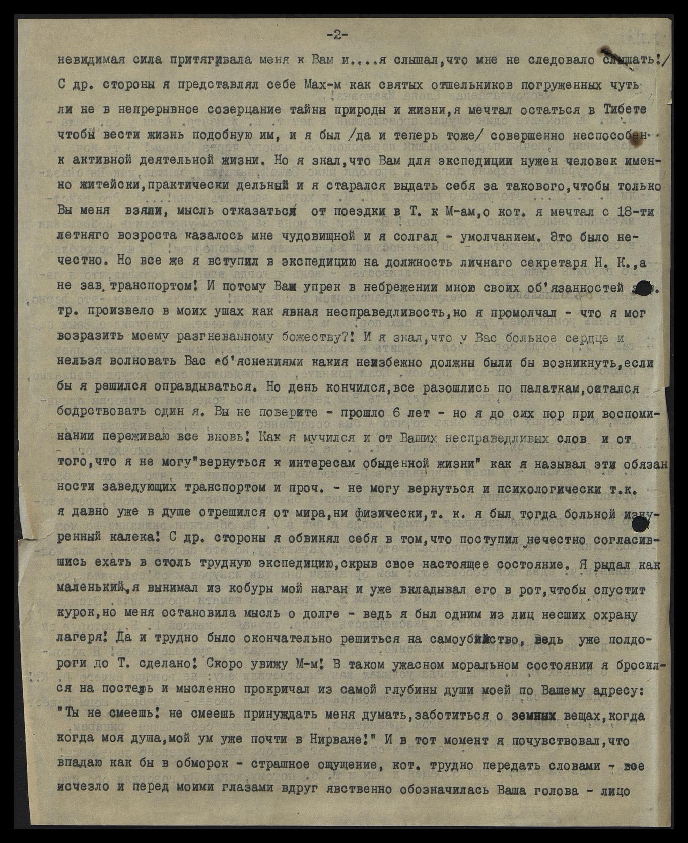 С од[ной] стороны я представлял себе Мах[ат]м как святых отшельников, погружённых чуть ли не в непрерывное созерцание тайны природы и жизни. Я мечтал остаться в Тибете, чтобы вести жизнь, подобную им, и я был (да и теперь тоже) совершенно не способен к активной деятельной жизни. Но я знал, что Вам для экспедиции нужен человек именно житейски, практически дельный и я старался выдать себя за такового, чтобы только Вы меня взяли. Мысль отказаться от поездки в Т[ибет] к М[ахатм]ам, о кот[орых] я мечтал с 18-тилетнего возраста, казалась мне чудовищной и я солгал — умолчанием. Это было нечестно. Но всё же я вступил в экспедицию на должность личного секретаря Н[иколая] К[онстантиновича], а не зав[едующего] транспортом! И потому Ваш упрёк в небрежении мною своих обязанностей зав[едующего] тр[анспорта] прозвенел в моих ушах как явная несправедливость, но я промолчал — что я мог возразить моему разгневанному божеству?! И я знал, что у Вас больное сердце и нельзя волновать Вас объяснениями, какие неизбежно должны были бы возникнуть, если бы я решился оправдываться. Но день кончился, все разошлись по палаткам, остался бодрствовать один я. Вы не поверите, прошло 6 лет, но я до сих пор при воспоминании переживаю всё вновь! Как я мучился и от Ваших несправедливых слов, и от того, что я не могу вернуться к "интересам обыденной жизни", как я называл эти обязанности заведующих транспортом и проч., не могу вернуться и психологически, так как я давно уже в душе отрешился от мира, ни физически, так я был тогда больной, изнурённый калека! С др[угой] стороны я обвинял себя в том, что поступил нечестно, согласившись ехать в столь трудную экспедицию, скрыв своё настоящее состояние. Я рыдал, как маленький, я вынимал из кобуры мой наган и уже вкладывал его в рот, чтобы спустить курок, но меня остановила мысль о долге — ведь я был одним из лиц, несших охрану лагеря! Да и трудно было окончательно решиться на самоубийство, ведь уже полдороги до Т[ибета] сделано! Скоро увижу М[ахат]м! В таком ужасном моральном состоянии я бросился на постель и мысленно прокричал из самой глубины души моей по Вашему адресу: "Ты не смеешь! Не смеешь принуждать меня думать, заботиться о земных вещах, когда моя душа, мой ум уже почти в Нирване!" И в тот же момент я почувствовал, что впадаю как бы в обморок — страшное ощущение, кот[орое] трудно передать словами: всё исчезло и перед моими глазами вдруг явственно обозначилась Ваша голова — лицо,