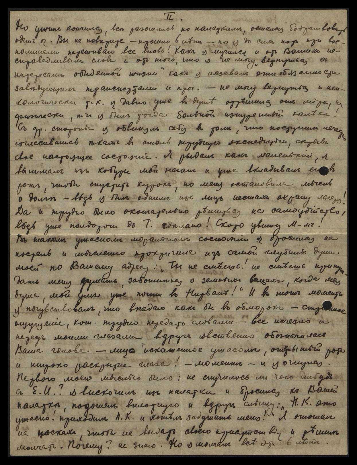 искажённое ужасом, открытый рот и широко раскрытые глаза! Момент — и я очнулся. Первою моею мыслью было: не случилось ли чего-нибудь с Е[леной] И[вановной]? Я выскочил из палатки и бросился к Вашей палатке, подошёл вплотную и вдруг слышу: "Н[иколай] К[онстантинович], это ужасно! Приходил П.К. и хотел задушить меня!" Я отошёл на носках, чтобы не выдать своего присутствия и решил молчать. Почему? Не знаю. Но я молчал все эти 6 лет.