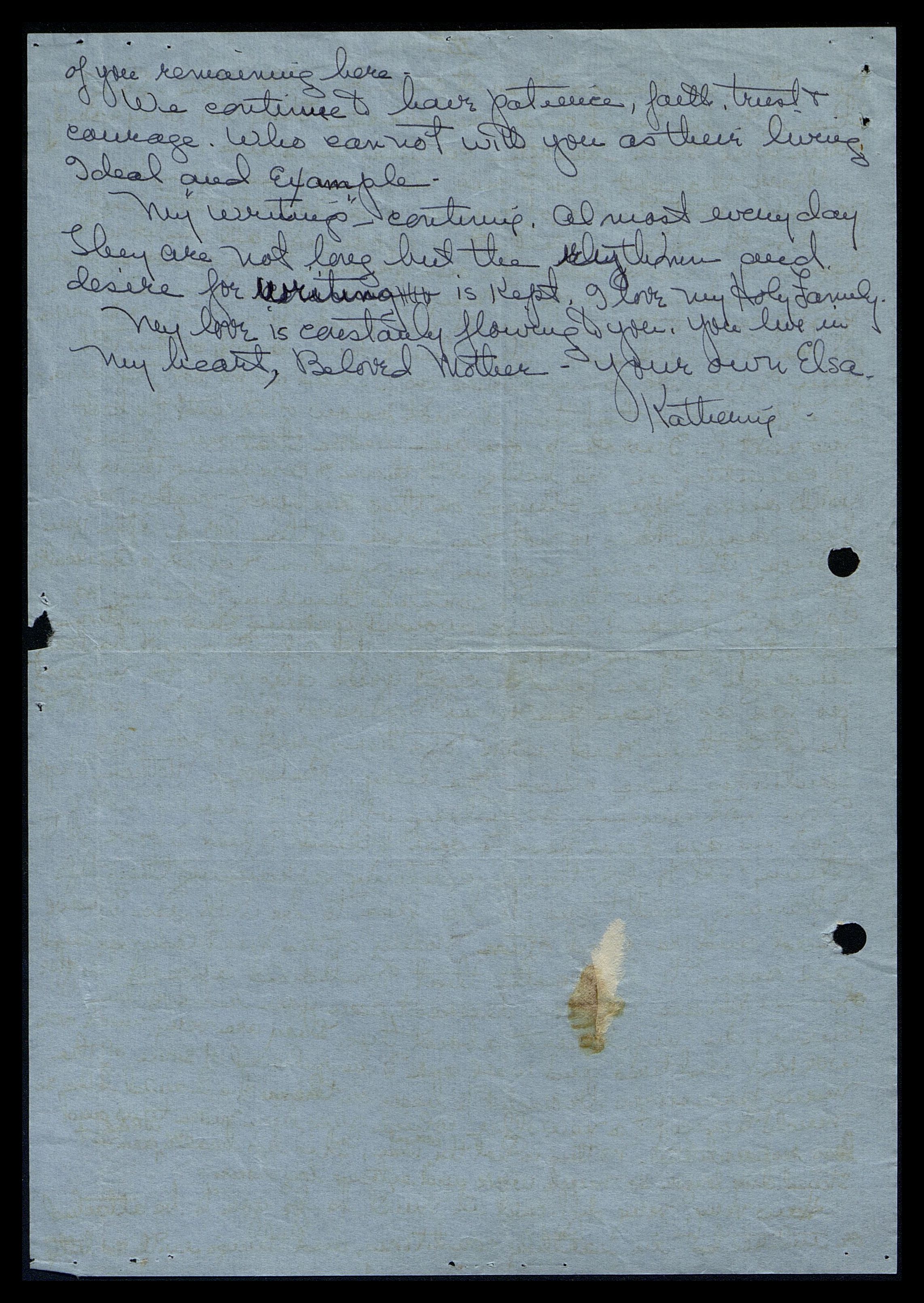 I continue with my “writings,” but I’m not really good. It seems my brain and arm are too heavy or thick to receive much. It is as though there is a solid block in me that keeps the spiritual energy from flowing or entering. I don’t know what it is, but truly, Beloved Mother, I’m ashamed at my lack of progress with my “writings,” [...]. Elsie [Leo Stern] is again kind, that is as kind as they can be and about the same otherwise.