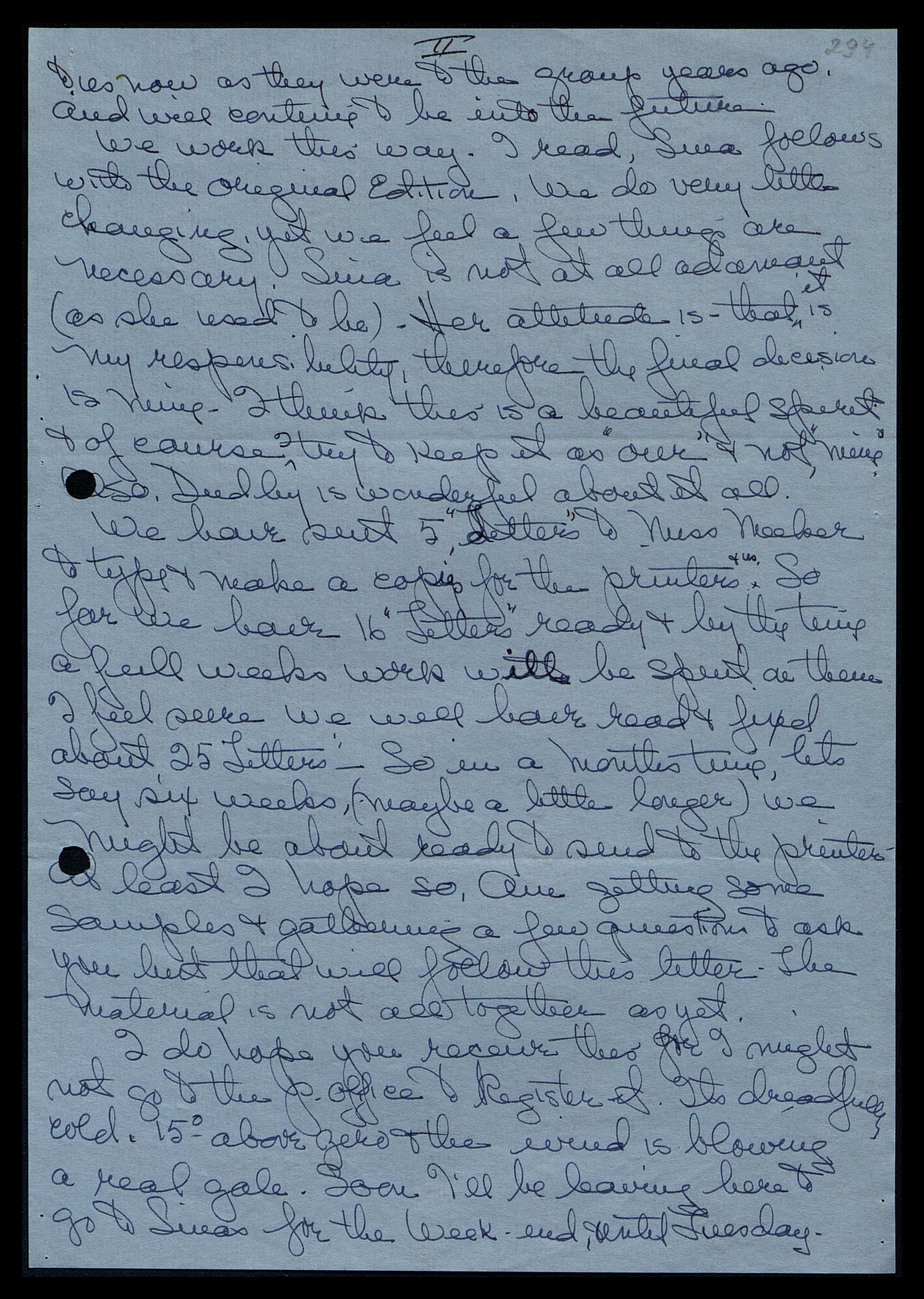 We have sent five Letters to Miss [Elizabeth] Meeker to type and make copies for the printers and us. So far, we have sixteen Letters ready, and by that time, a full week’s work will be spent on them. I feel sure we will have read and fixed about twenty-five Letters. So, in the month’s time, let’s say six weeks (maybe a little longer), we might be about ready to send to the printers. At least, I hope so. Am getting some samples and gathering a few questions to ask you, but that will follow this letter. The material is not all together as yet.