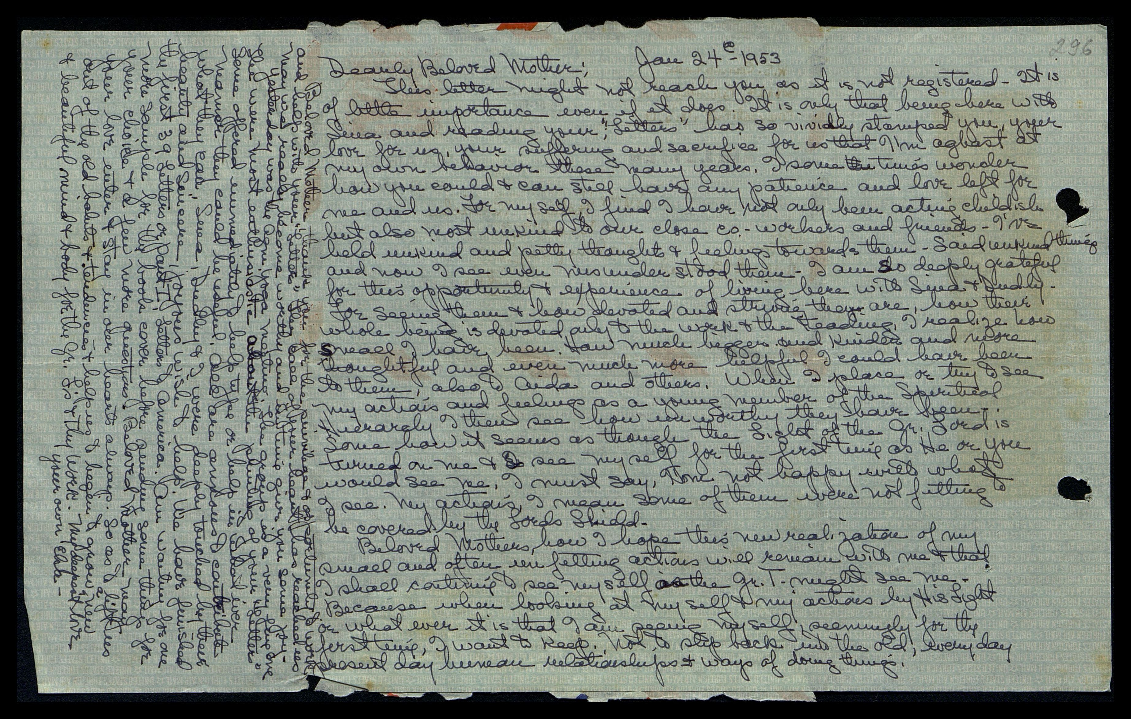 Beloved Mother, how I hope this new realization of my small and often unfitting actions will remain with me and that I shall continue to see myself as the Gr[eat] T[eacher] might see me. Because when looking at myself and my actions by His Light, or whatever it is that I am seeing myself, seemingly for the first time, I want to keep. Not to slip back into the old everyday day, present-day human relationships and ways of doing things.