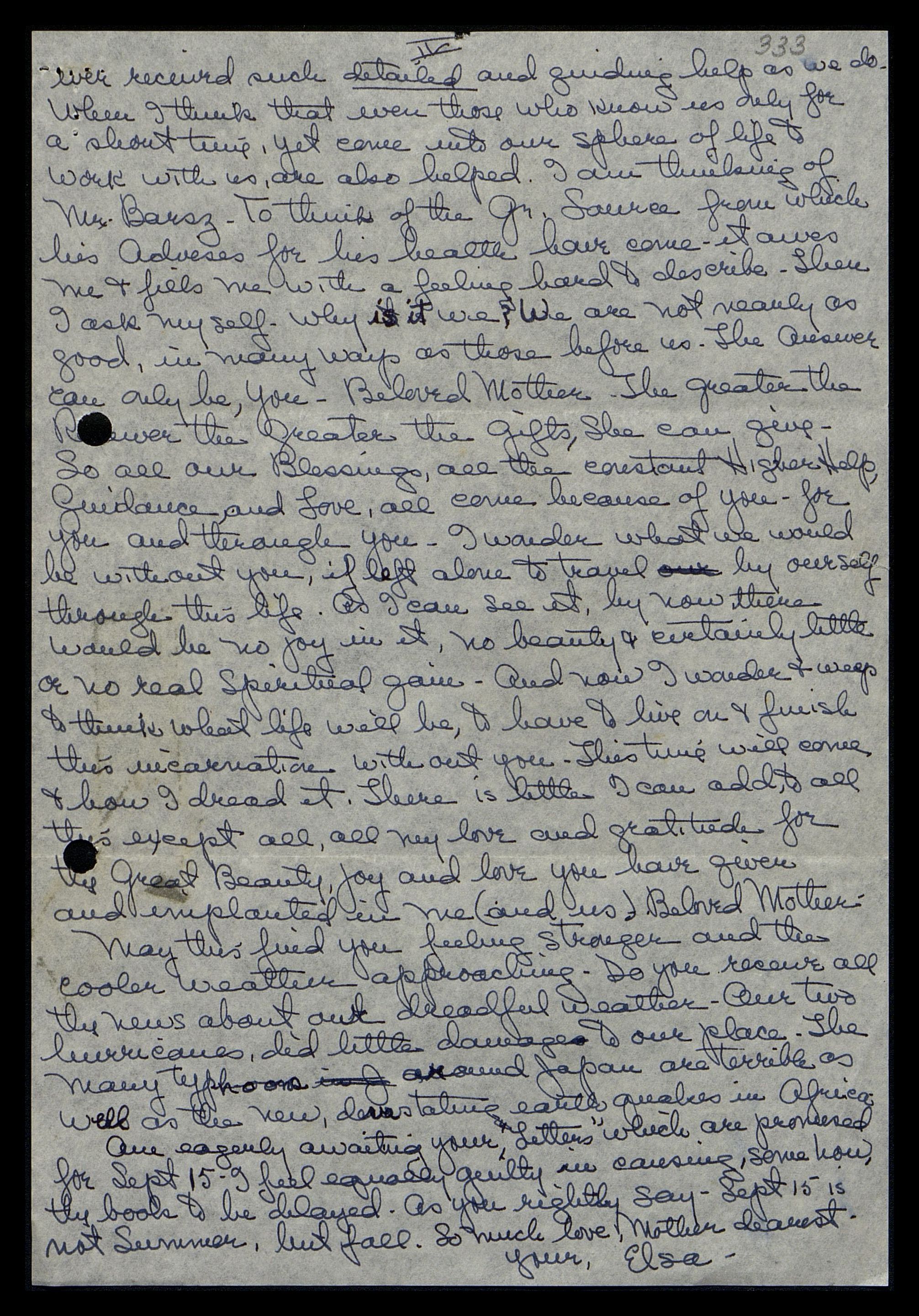 ever received such detailed and guiding help as we do. When I think that even those who know us only for a short time, yet come into our sphere of life to work with us, are also helped. I am thinking of Mr. Barsz. To think of the Gr[eat] Source from which his Advice for his health has come, it awes me and fills me with a feeling hard to describe. Then, I ask myself, why is it we? We are not nearly as good in many ways as those before us. The answer can only be you, Beloved Mother. The greater the R[...]ver, the greater the gifts She can give; so, all our Blessings, all the constant Higher Help, Guidance, and Love, all come because of you, for you, and through you. I wonder what we would be without you if left alone to travel by ourselves through this life. As I can see it, by now, there would be no joy in it, no beauty, and certainly little or no real spiritual gain. And now I wonder and weep to think what life would be to have to live on and finish this incarnation without you. This time will come, and how I dread it. There is little I can add to all this except all, all my love and gratitude for the Great Beauty, Joy, and Love you have given and implanted in me (and us) Beloved Mother.