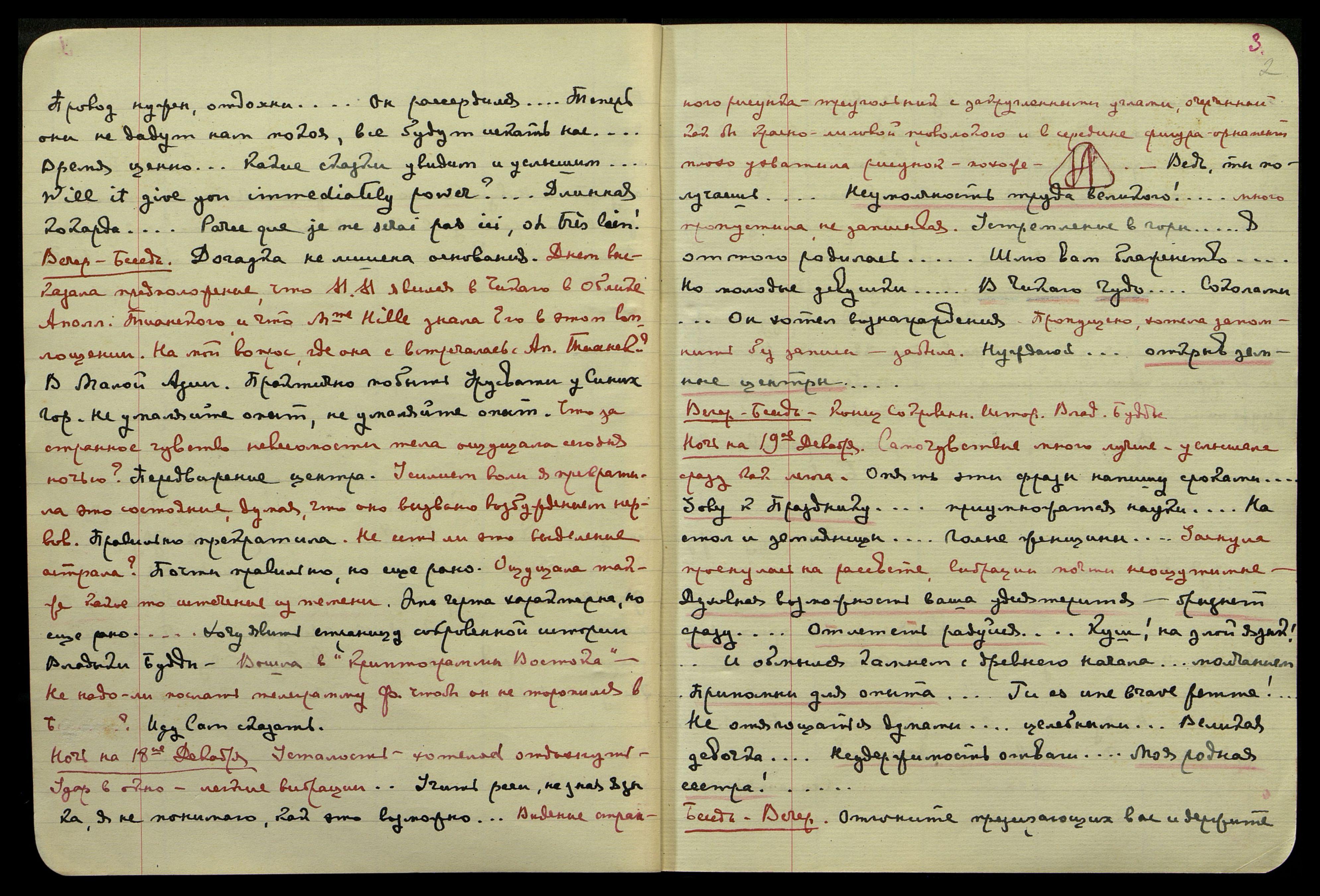 Ночь на 18-ое Декабря. Усталость, хотелось отдохнуть. Удар в окно, лёгкие вибрации. Учить речи, не зная языка, я не понимаю, как это возможно... Видение странного рисунка: треугольник с закруглёнными углами, очерченный как бы красно-лиловой проволокою и в середине − фигура, орнамент плохо ухватила, рисунок − похоже − [рисунок] Ведь, ты получаешь... Неумолчность труда великого!... много пропустила, не записывая. Устремление в горы... Я оттого родилась... Шлю вам блаженство... Но молодые девушки... В Чикаго Чудо... Соколами... Он хотел вознаграждения. Пропущено, хотела запомнить без записи − забыла. Нуждаюсь... открыв земные центры...